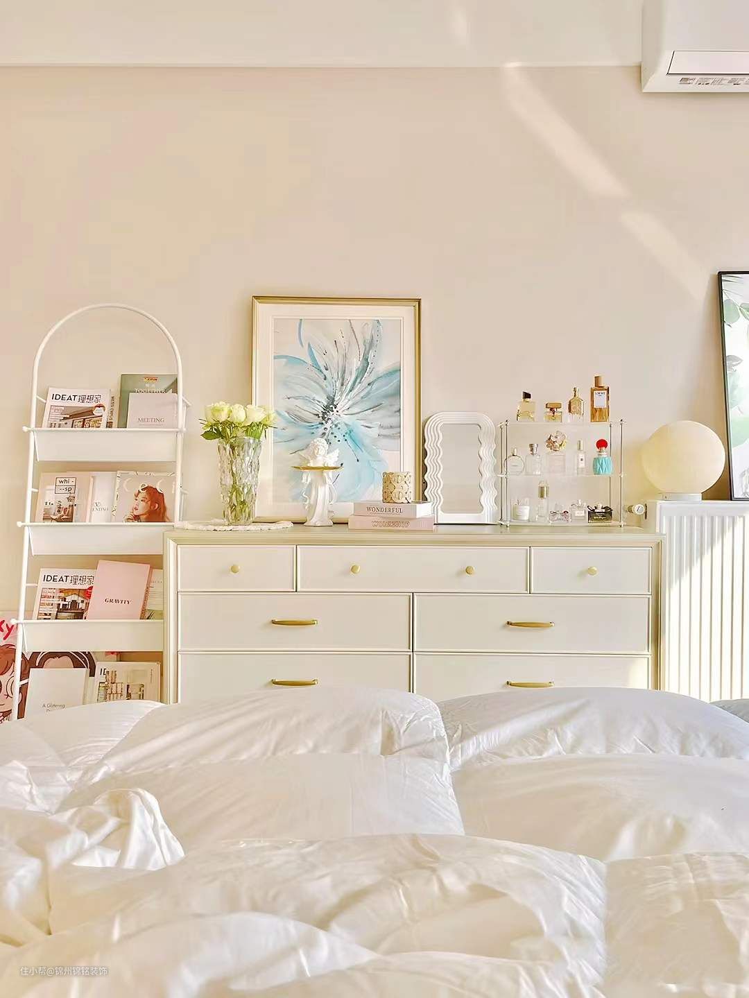 墙面通刷奶油色乳胶漆,实际颜色偏米粉调,房顶为瓷白色乳胶漆。单眼皮吊顶下吊22公分,搭配14公分线条,性价比高,也不压层高。卧室背景墙,4公分石膏线条-30公分角花,有法式轻奢的感觉,低预算好选择画。