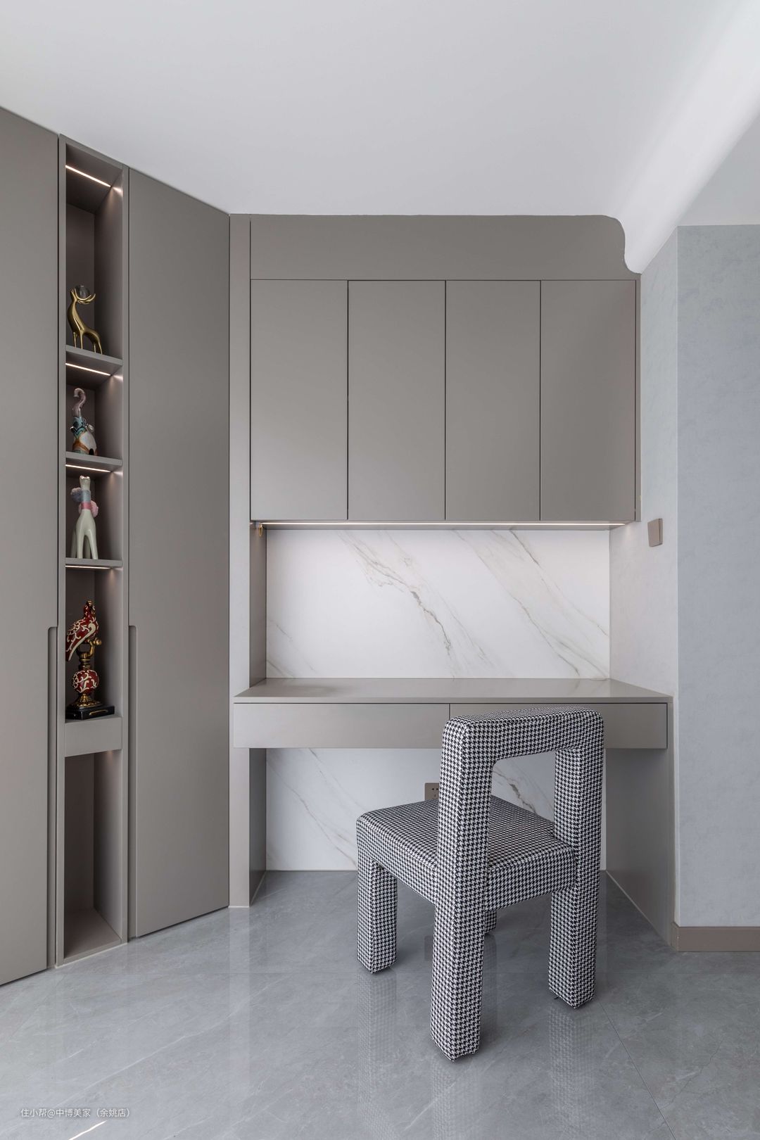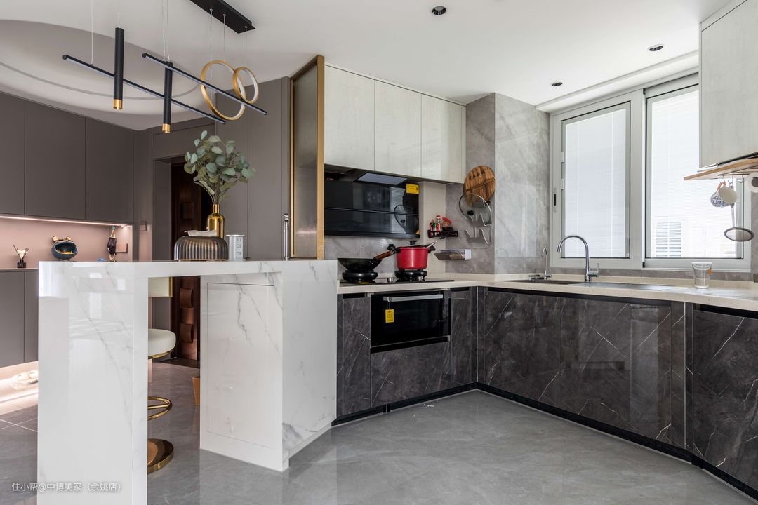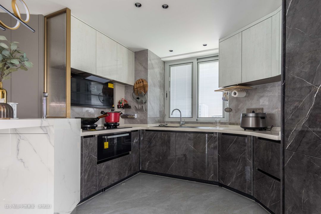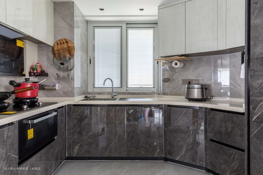 厨房墙地砖使用灰色大理石纹理,与灰色的厨柜相呼应,看起来就十分的干净利落。