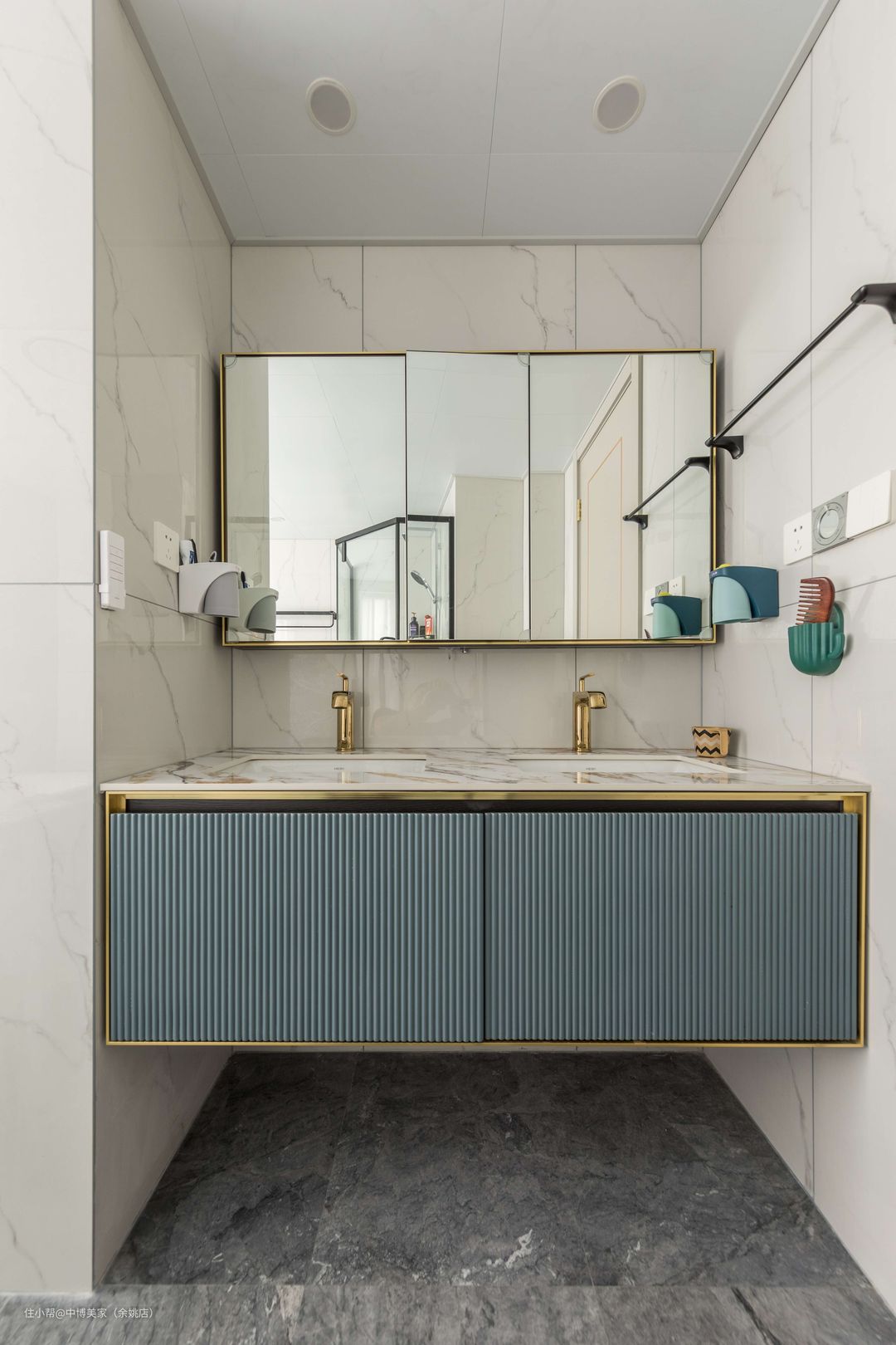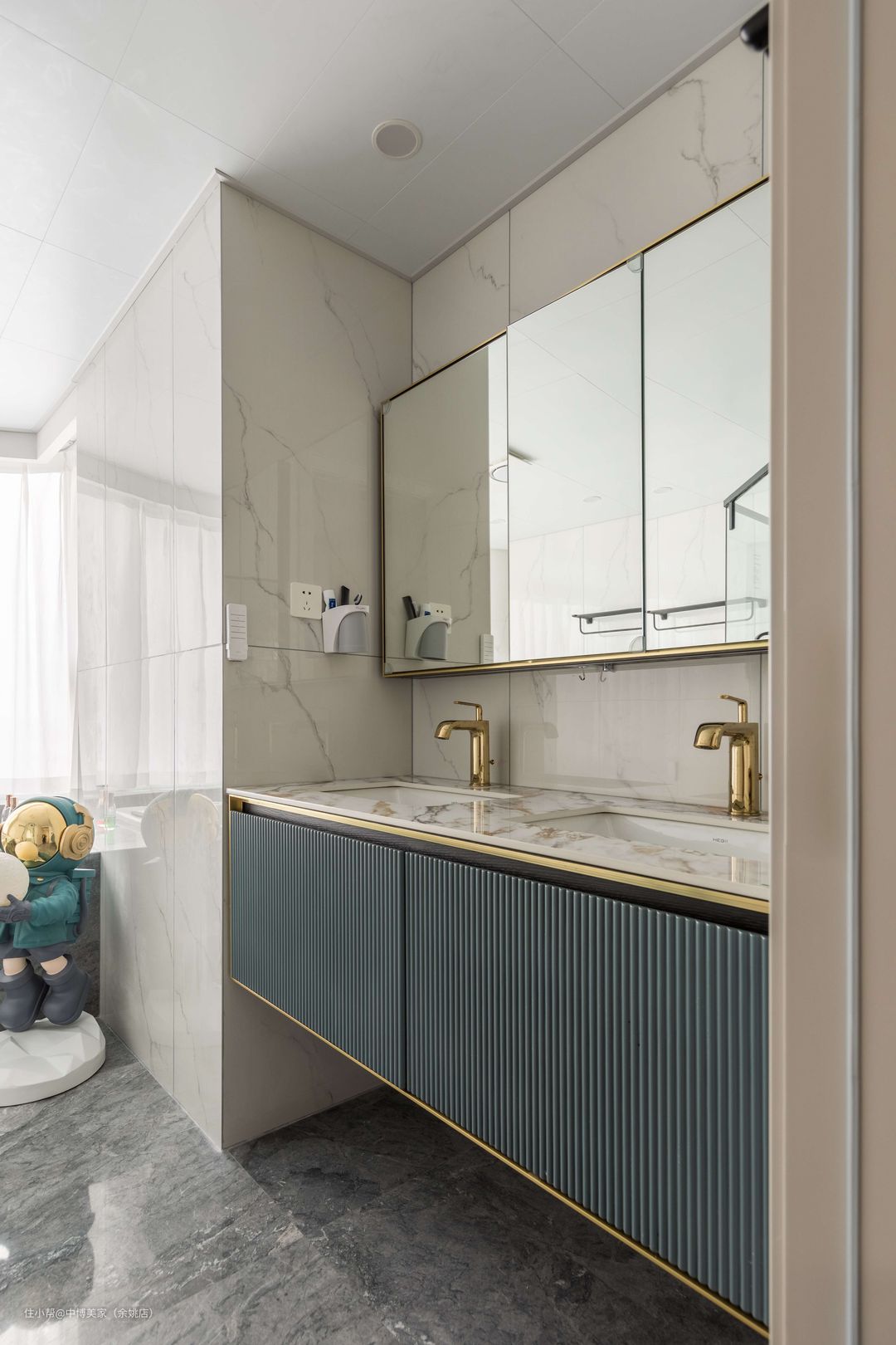 定制的双人位洗手盆+长形的洗漱镜,家人再也不用排队洗漱,实用性超强,提供了舒适方便的洗漱体验。