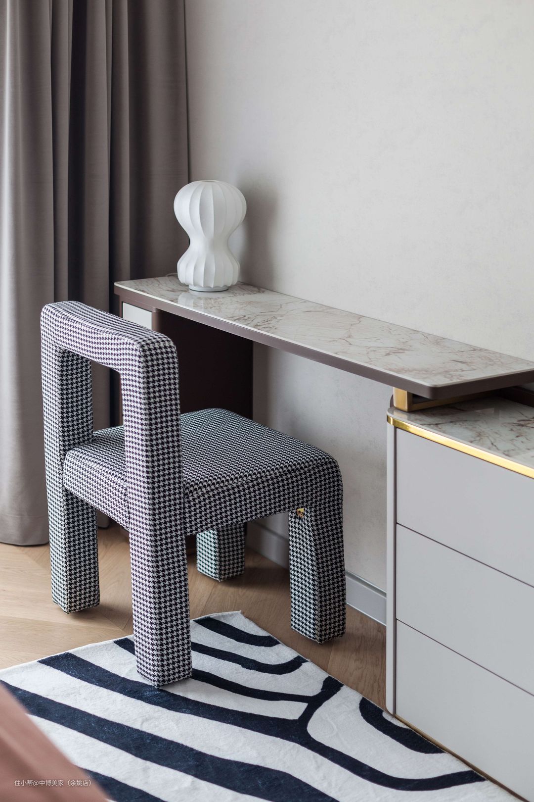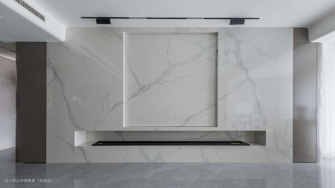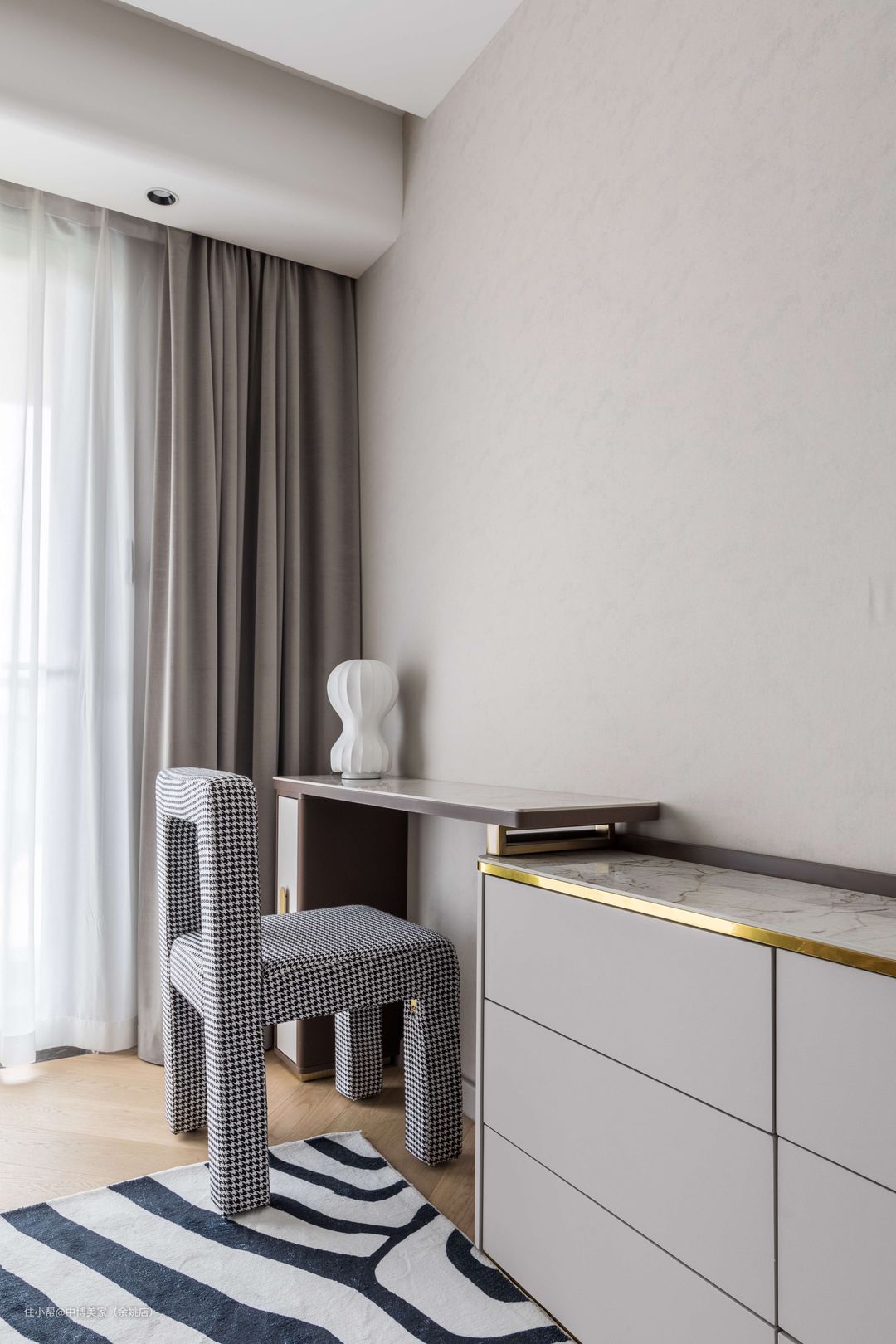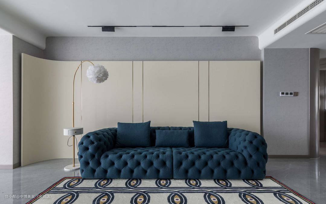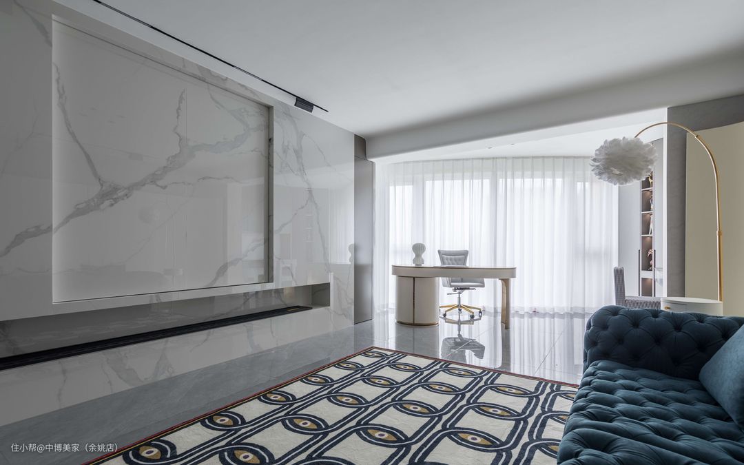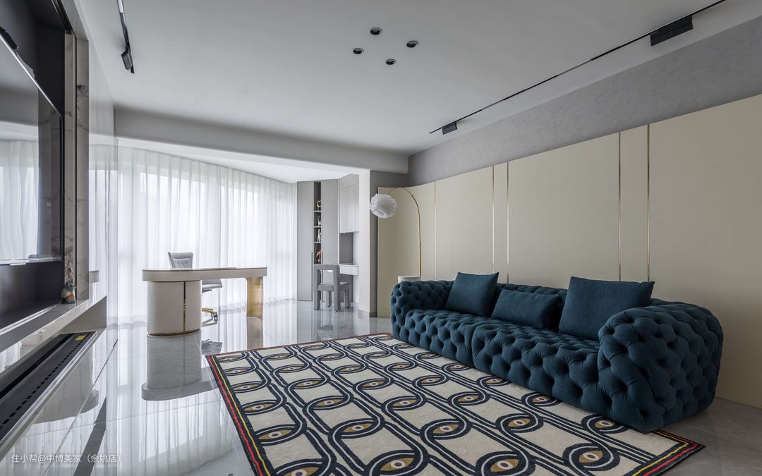 沙发背景墙在灰色的背景基础,加上白色木饰面,并辅以金色线条点缀,地面铺上个性款的地毯,显得自然优雅而大方。