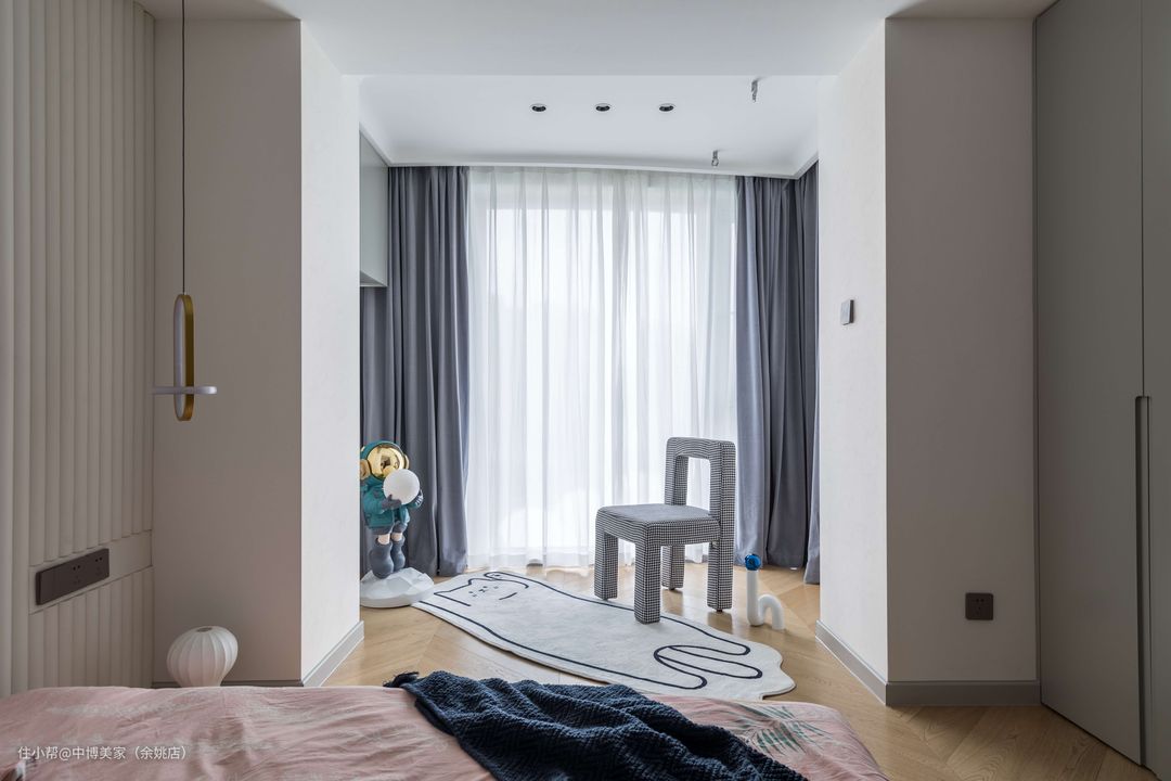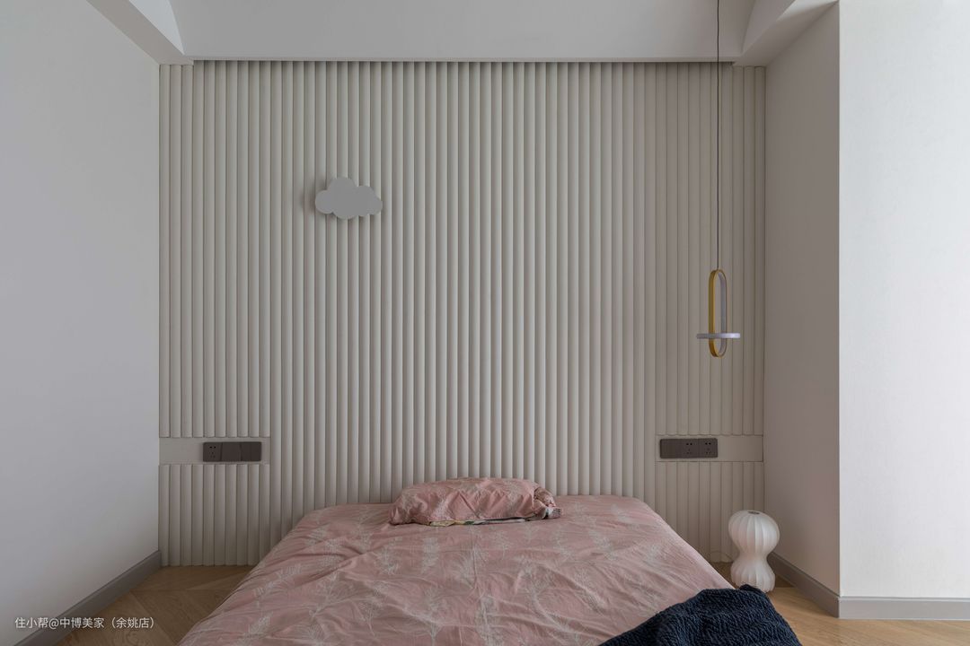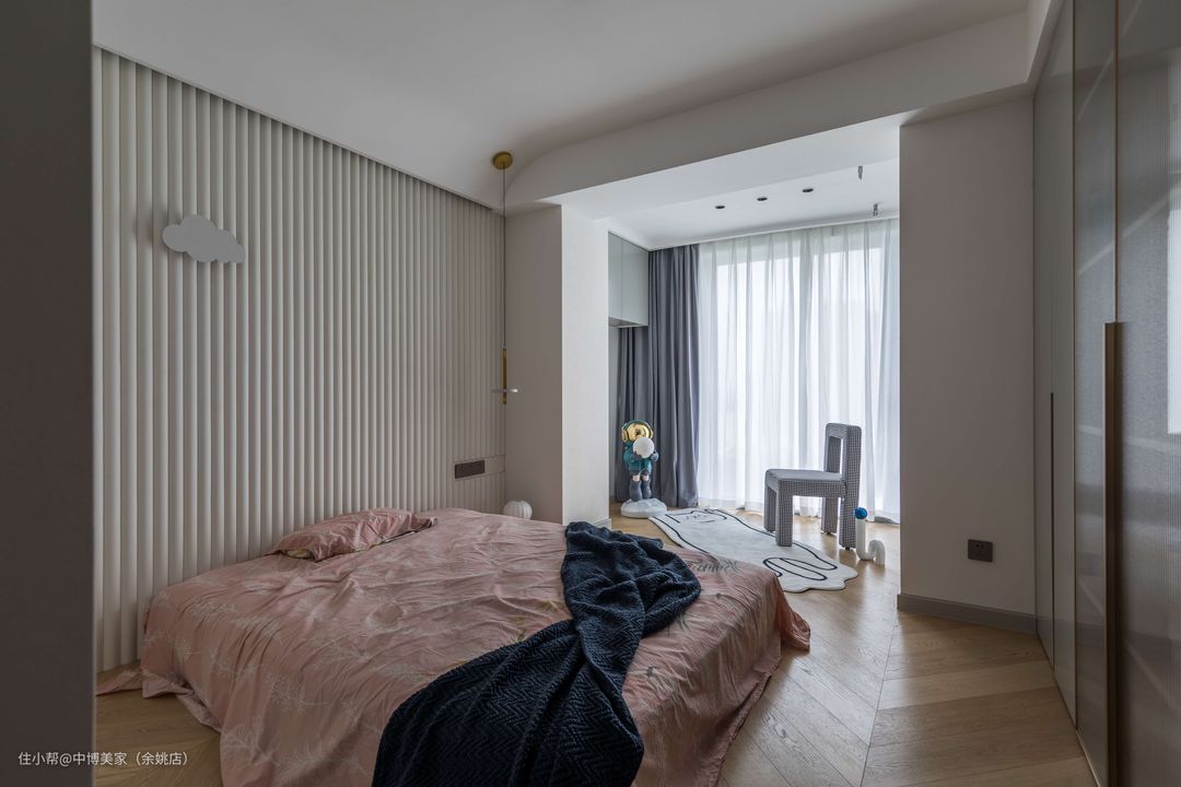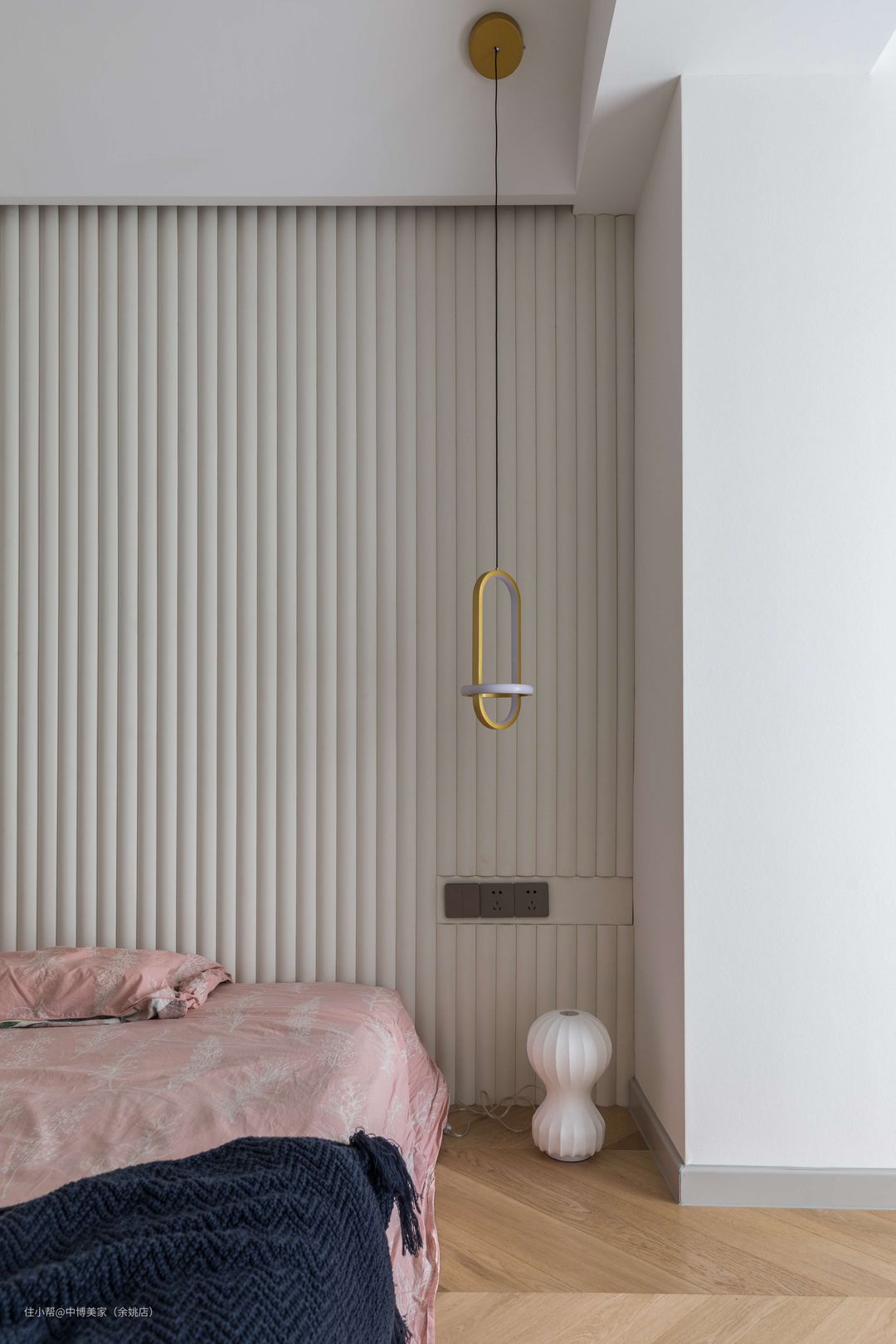 卧室正中间位置摆上简约的大床,铺上一套粉白色的床品,充满了轻松惬意的气息。