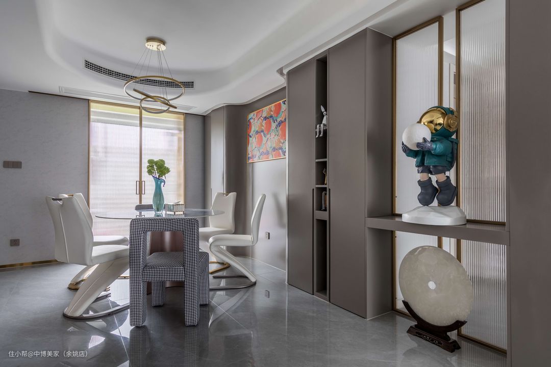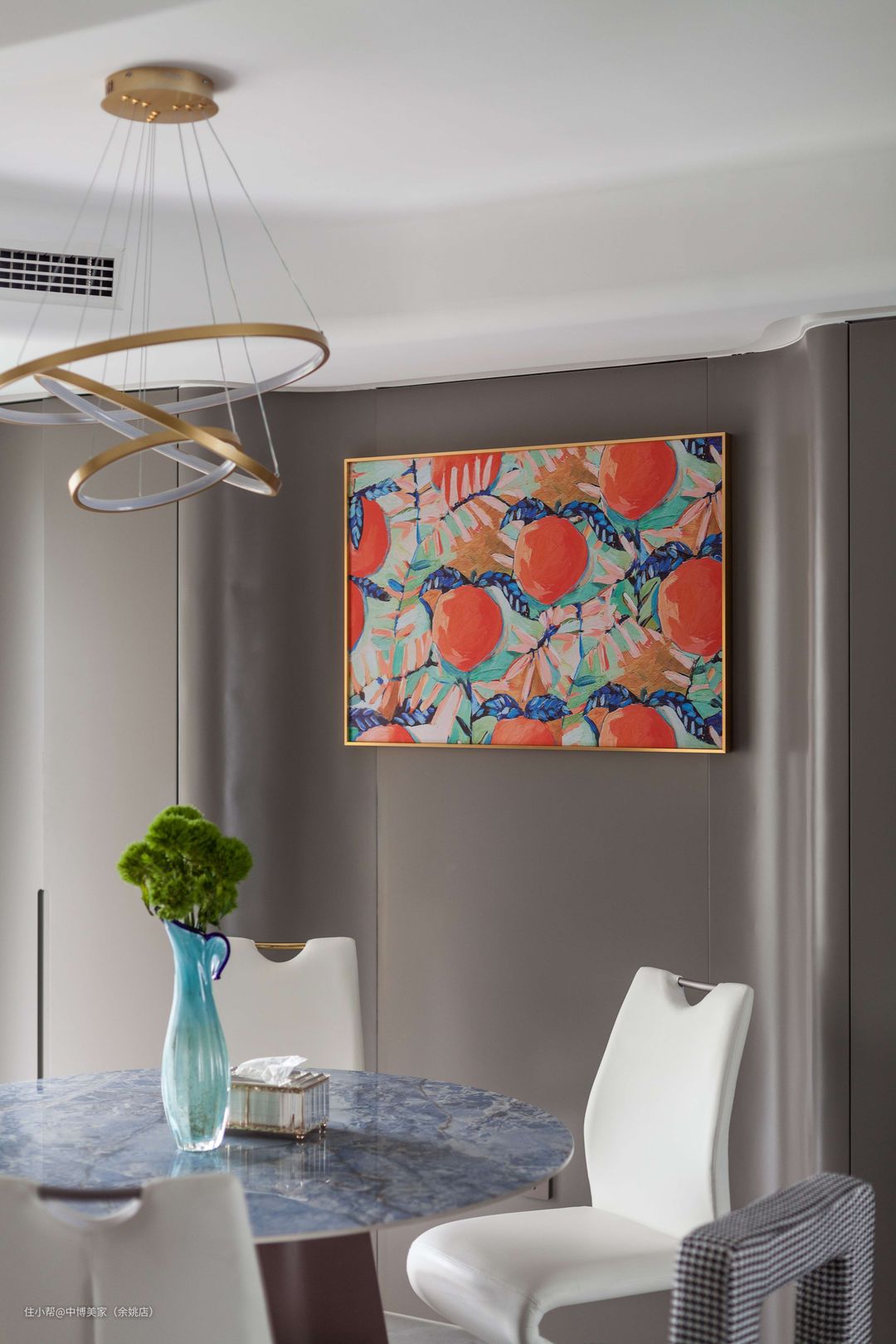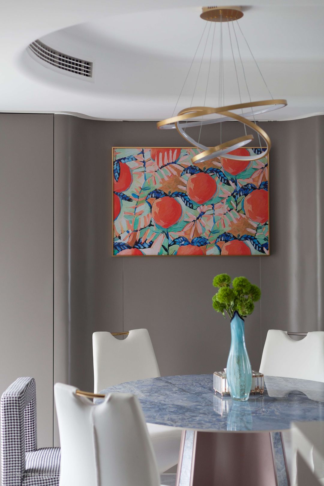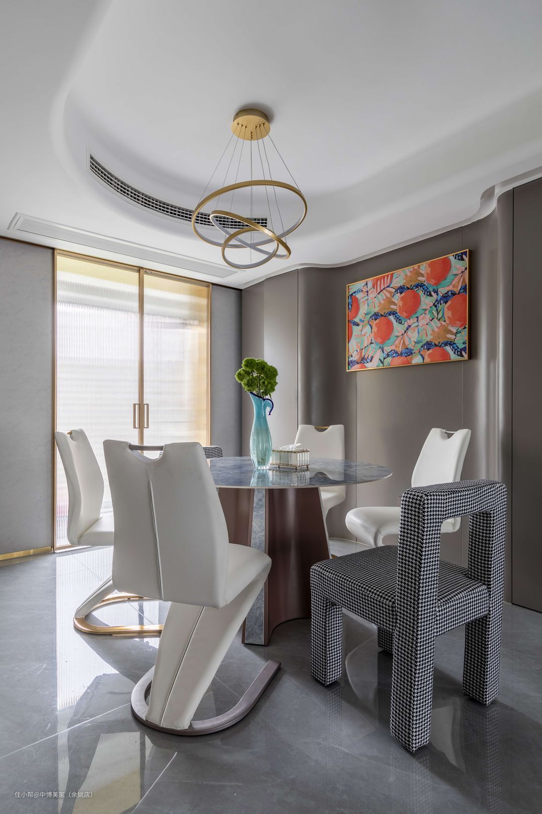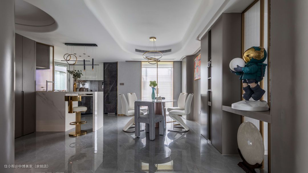 餐厅与客厅保持一致的灰色地面,布置白色皮艺餐椅和大海蓝台面的岩板餐桌。