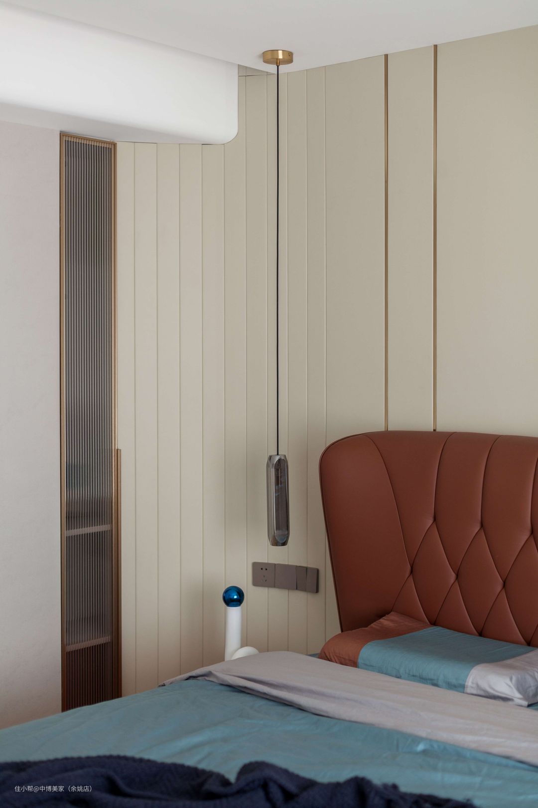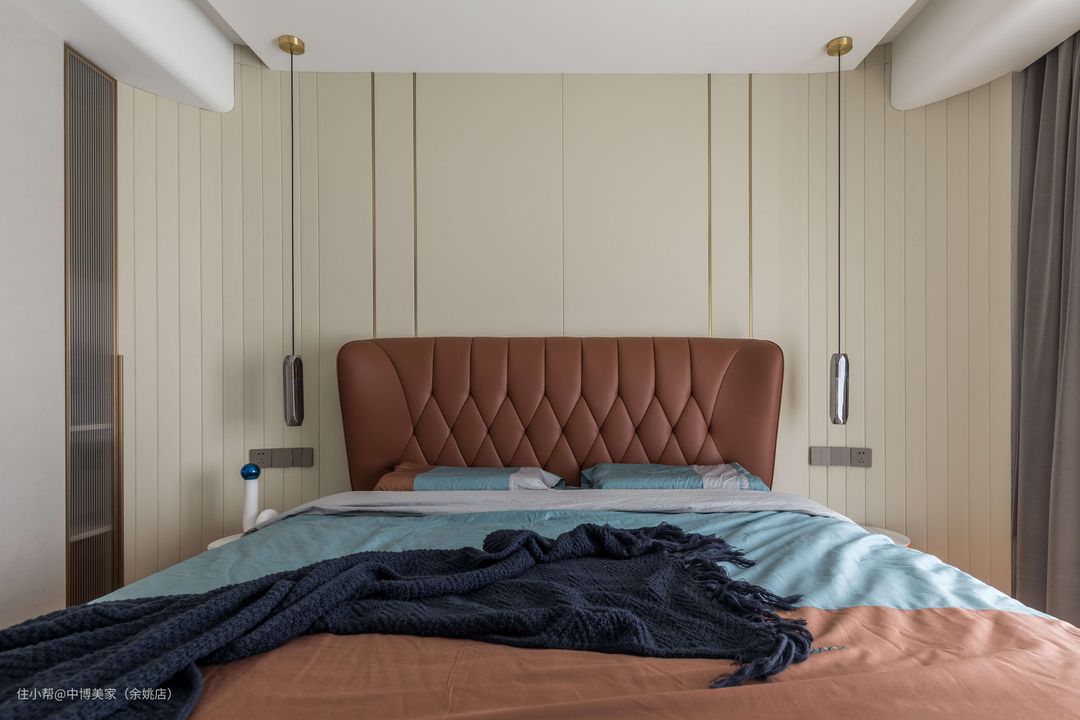卧室床头墙整体香槟金的硬包基础上,布置红棕色的双人床和浅棕拼接的床铺,让卧室空间充满安静优雅的质感。