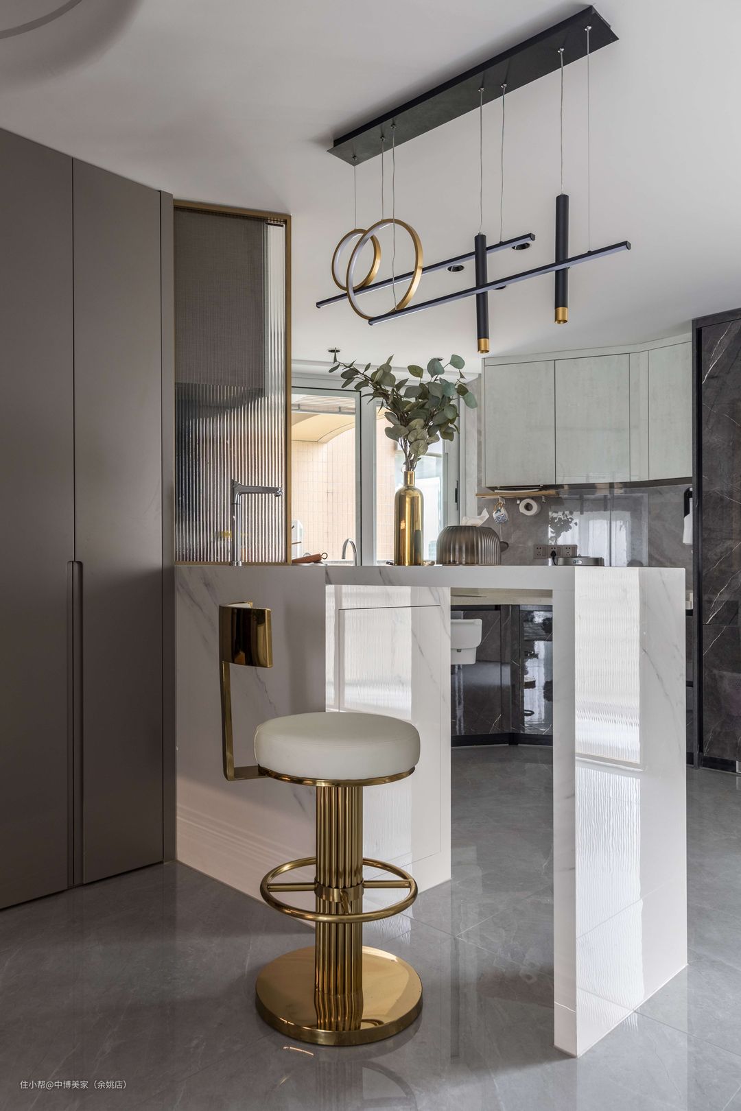 餐厅一侧还打造吧台,结合金属质感的条形餐厅吊灯,不仅增加了空间之间的互动,而且在吧台用餐也能丰富生活仪式感。
