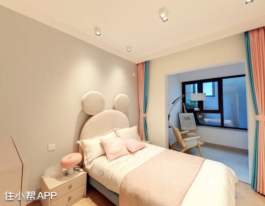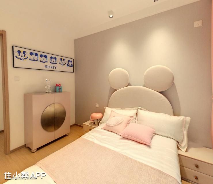 儿童房以各式粉嫩的色彩、可爱的元素搭配,整体充满童趣、大方。房间最里侧是一个宽敞的阳台,阳台上布置一落地灯,搭配一张网红椅子和休闲画板,闲暇之余还可以小坐,画上一幅精美的画作,也是非常的有情趣; 房间内大床有着兔子状床头的大床,整体充满童趣可爱,大床一旁以简约的床头柜搭配,配以粉嫩的床头灯,简约又不失大方; 设计师还充满使用了房间多余的空间,在床头角落一侧布置一个小巧的收纳柜,收纳柜的柜面上以可爱的物件装饰,墙体上以可爱的米奇壁画点缀,整个房间角落的位置充满趣味且不失单调。
