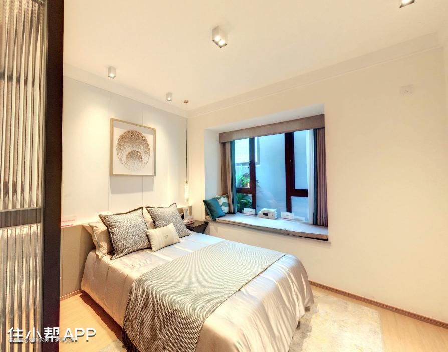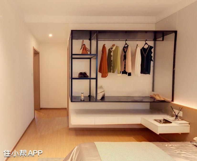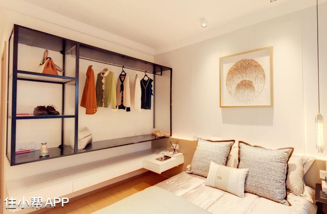 主卧整体的布置显简约但不失奢华,房间四周以射灯点缀,床头一侧加以长条吊灯搭配,整体光线充足。床头上方的背景墙以大气壁画点缀,整个墙面尽显精致。最里侧则是开设一扇小飘窗,窗台上布置毛毯、小抱枕,方便闲暇之余坐在飘窗处思考人生; 房间另外一处更有特色的布局则是一个开放式的衣柜,衣柜以黑色铁框搭建,一侧为挂衣区,一侧为三层的置物区,衣柜下方还有一个贴墙式的置物台,既可当床头柜使用,又可收纳放置更多的物品。
