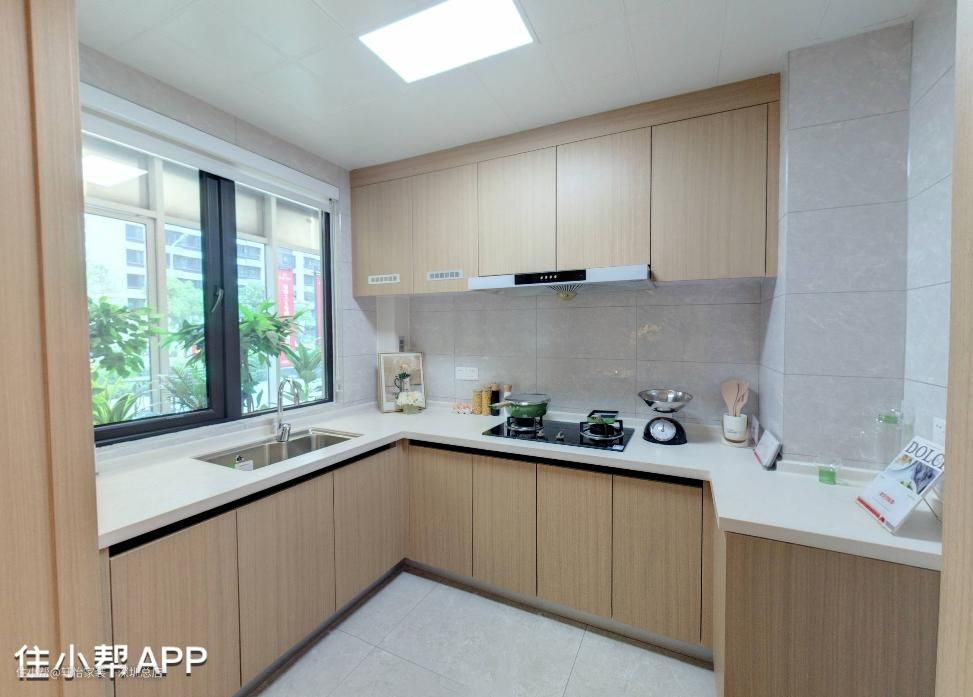 厨房在布局上采用U型的设计方式,色彩上采用了素雅的灰色调及卡其色调,都属于浅色色系,整体视觉上显通透明亮。卡其色调的橱柜围绕案台上下方镶嵌,整体增加了厨房的收纳容量。
