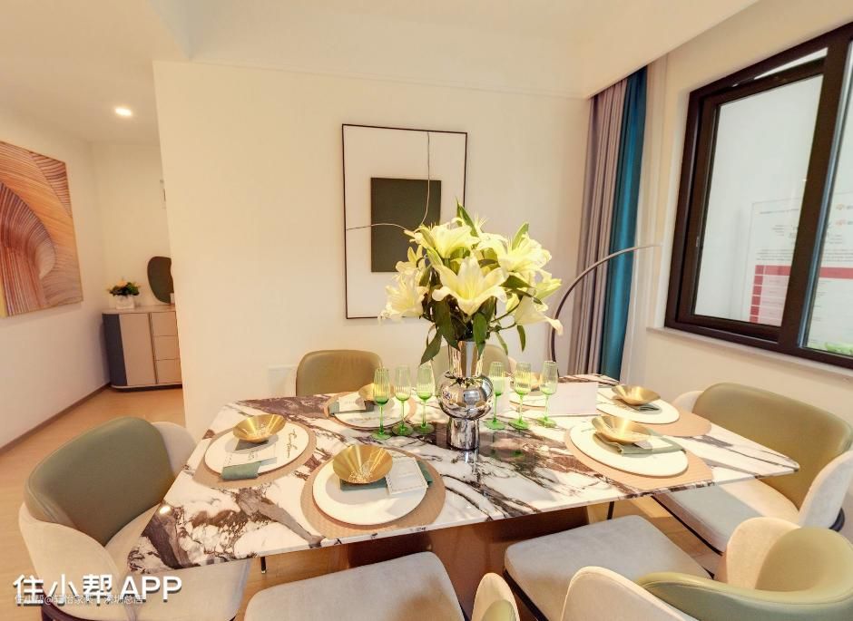 餐厅是一个家庭居室里面一起共享天伦之乐的地方,本期案例的餐厅,足够可以容纳下6人的家庭就餐或者是招待朋友一起享受美味; 餐厅的墙面上以精致壁画点缀,整体显大气。餐桌则是采用大理石纹的长桌,桌面加以奢华的餐具做中式摆盘,再搭配一瓶鲜艳的花束,整体显奢华高贵。