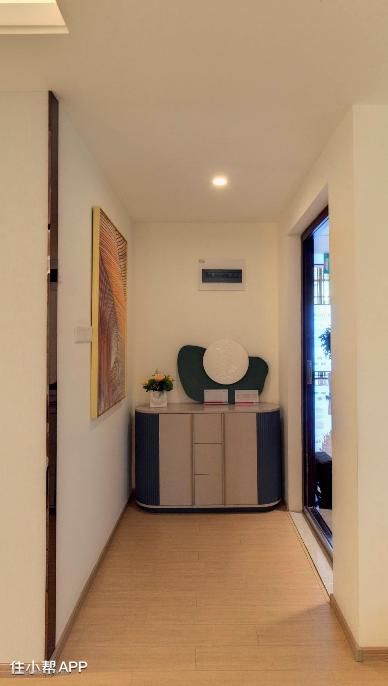 本期案例应业主的需求,在入门处设置玄关,本期玄关以长走廊的布局方式,墙面上悬挂大气壁画; 另置办一简约橱柜,便于忙碌一天后各式衣物鞋物的收纳。