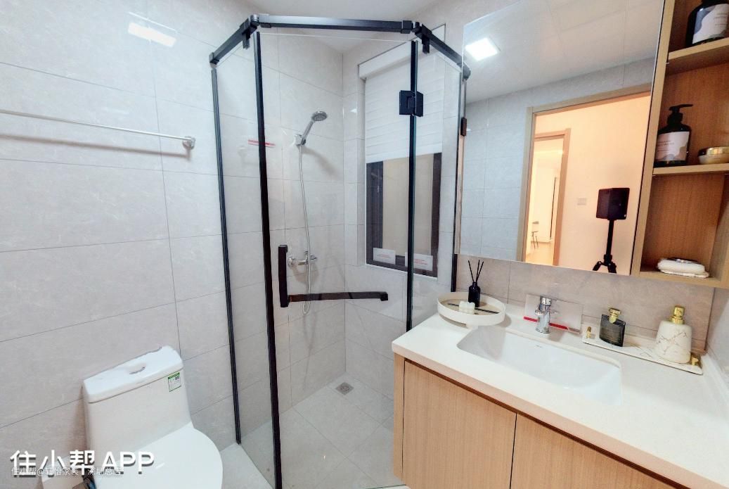 卫生间在瓷砖选择上采用了白净的色彩,白净的颜色使得卫生间在视觉上显得通透明亮。本期主卫生间整体空间布局错落有致,淋浴的区域以环绕的透明玻璃门隔开,有效防止水滴外溅,保持空间上的干爽。而如厕以及洗漱的位置围绕淋浴区而置,空间虽小,但显大气。