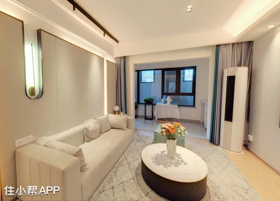 客厅的设置,设计师巧妙地利用阳台的空间,把阳台多余的墙体打通,使得整体的空间足够宽阔 客厅一侧以浅米色的沙发贴墙而置,中间布置一张大理石纹的圆桌,加以地面素雅的地毯铺垫,整厅显素雅大气。