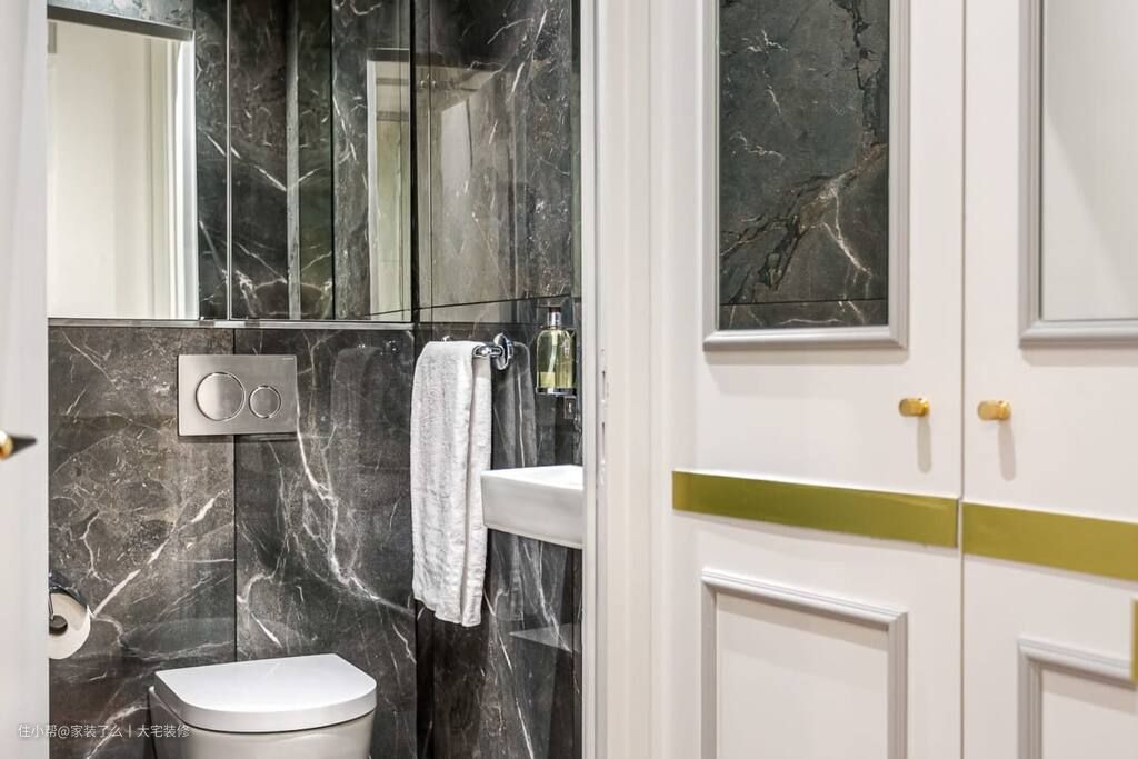 卫生间用玻璃隔断将淋浴区独立了出来,打造了干湿分离的洗浴空间。淋浴区里面选用了大理石材质,时尚美感的同时方便业主打理。墙面上做了壁龛设计,方便摆放洗浴用品。淋浴区外是盥洗区,通身选用了大理石材质,看起来干净舒适。壁挂式马桶防潮的同时还能避免产生卫生死角,易于清理。卫生间外设计了储物柜,白色木门上方是镜子,通透明净,中间的金黄色条框中和了白色带来的单调感。