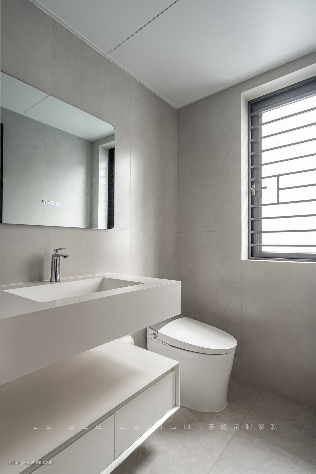 卫生间选择了仿微水泥砖面,洗手台选择了岩板材质的一体式台盆,为的是打造一个拥有侘寂风的卫生间。极简主义是美感的另一种加持。