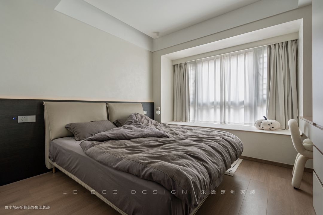 次卧舍弃了传统的床头柜,将床头柜设计为和衣柜一体的形式,空间的利用更加灵活,既不会影响衣柜的使用,床边置物空间也得到了增加。