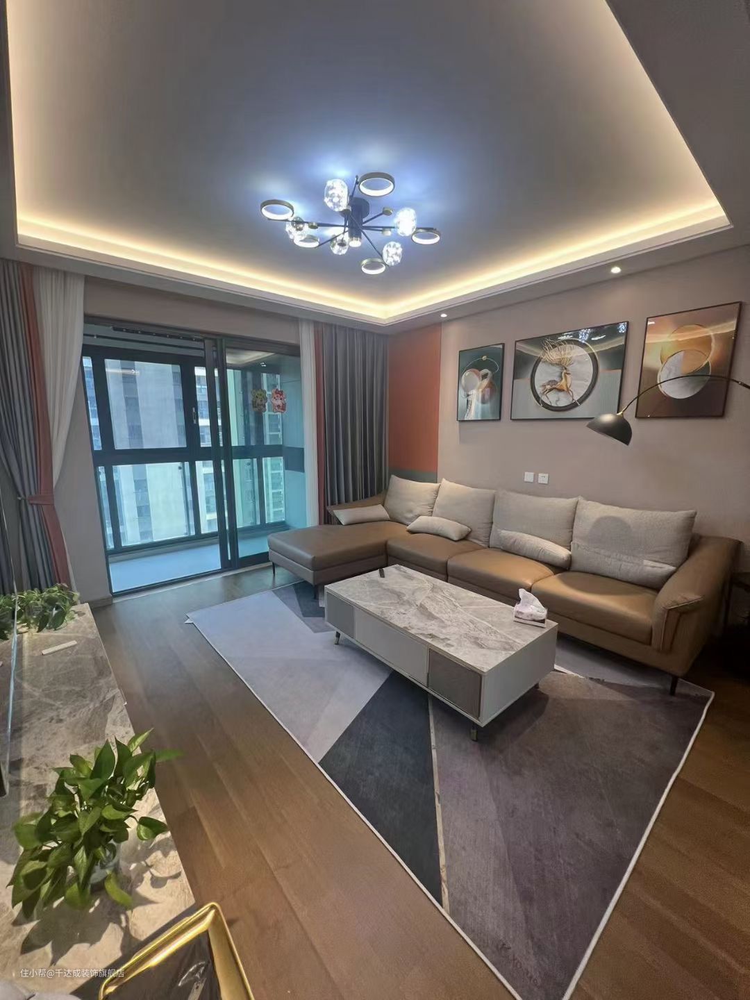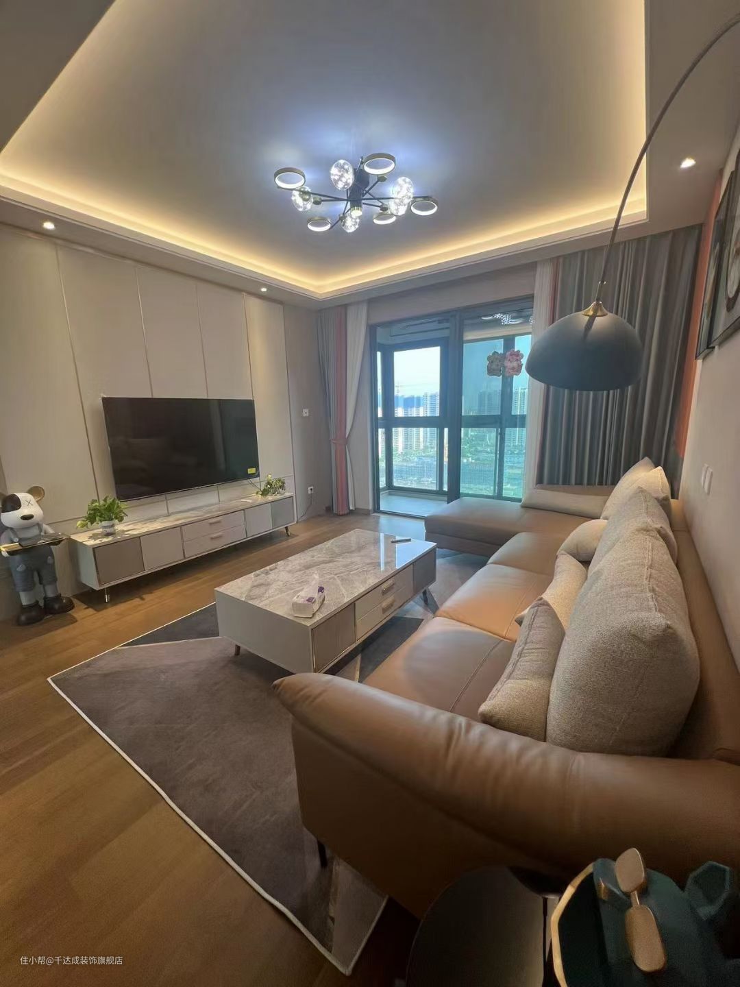 客厅布置简洁,包含许多北欧风元素,以壁画、软装展示出来,电视背景墙用板材硬装做背景装饰,地板选用实木地板,具有木材自然生长的纹理,是热的不良导体,能起到冬暖夏凉的作用,脚感舒适,使用安全的特点。