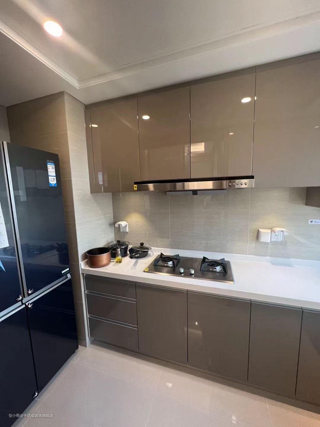 厨房做L型格局,最大化利用空间,台面选用石英石台面,优点是耐磨不怕刮划,耐热好看大面积铺贴,拼接无缝,经久耐用。