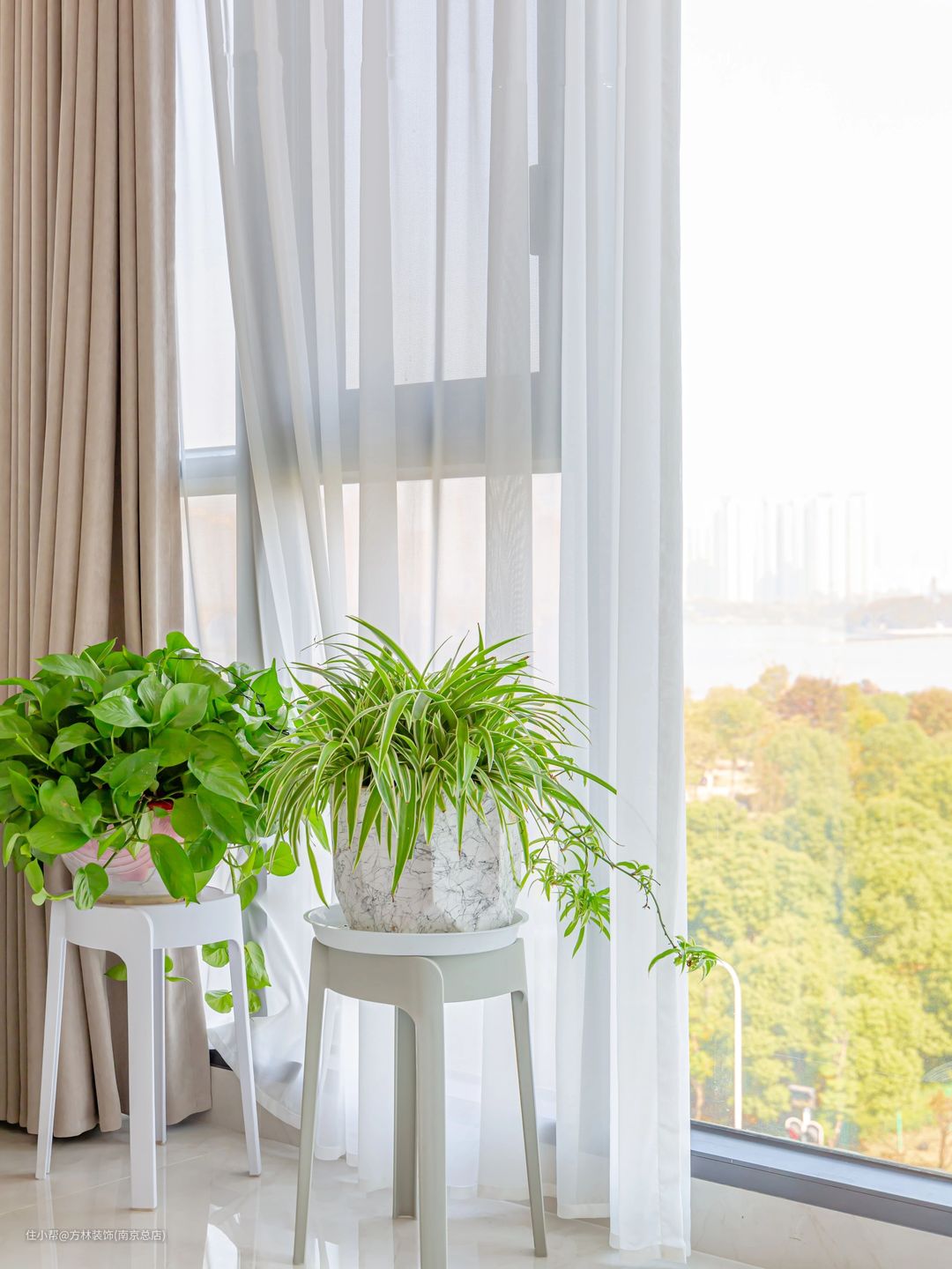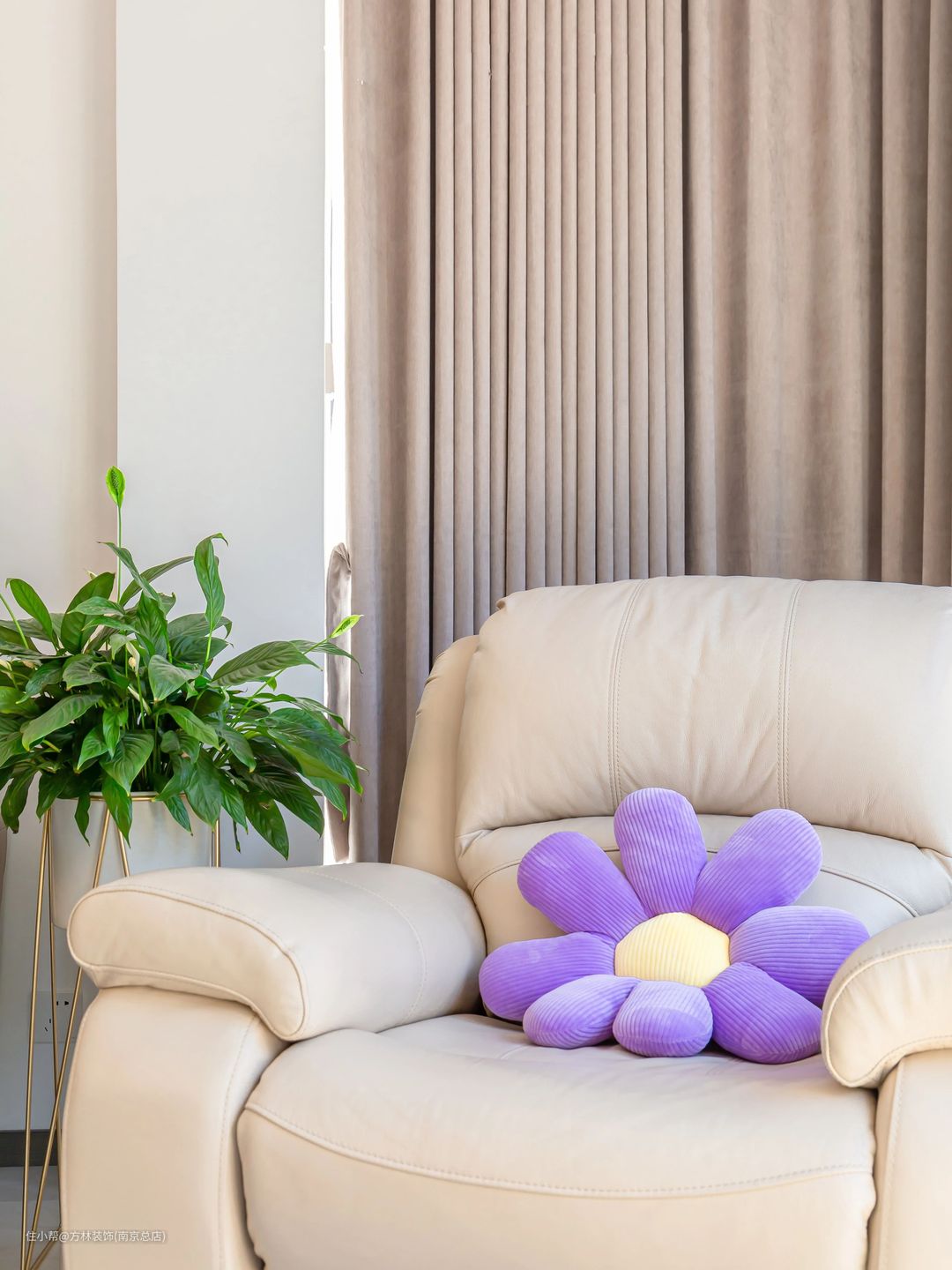 阳台一侧设计了洗衣区,晾晒更方便,还能节省卫生间的空间~角落里放置的绿植让整个空间更有活力~业主喜欢在阳台晒太阳,就在阳台放置了一个米白色的懒人沙发,搭配紫色花花抱枕,更是亮眼~