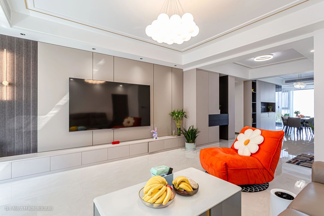 空间中不同材质的延伸,促成了温柔恬静的理想生活。简约舒适的皮质沙发加入橙色的点缀,呼应电视背景墙一侧的格栅与一角的绿植,随心几笔便使空间的色彩达到视觉平衡,丰富而不显繁杂,平淡中也多了份闲情逸趣。闲暇之余,与花共舞。隔着落地窗,阳台的清新与绿意透过玻璃,坐在客餐厅里也能感受得到。空间点缀绿意,为生活注入一些温柔梦想。立体几何在空间中的流露,纯粹而又富有理性简约的向往。正如电视背景墙选用格栅的设计,纹路细腻有层次,生活中也不乏庄重与仪式感。