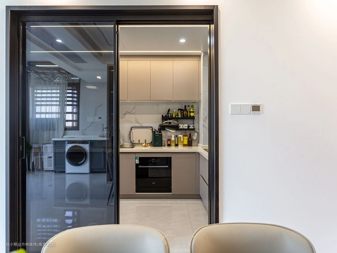 在餐厅的后方就是就是厨房空间,L型布局的橱柜,冰箱摆放在了厨房的一侧,以灰色地砖搭配白色墙砖和木质橱柜,整体显得很有轻奢感。现代化的厨房,整洁干净。厨房有烟火,身旁有家人,心里有爱,这是生活平凡而美好的模样~