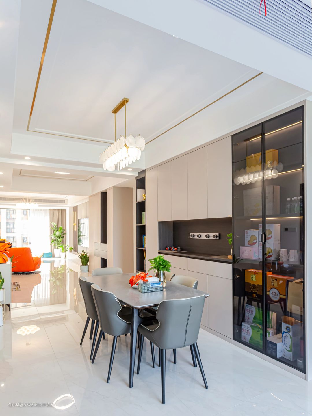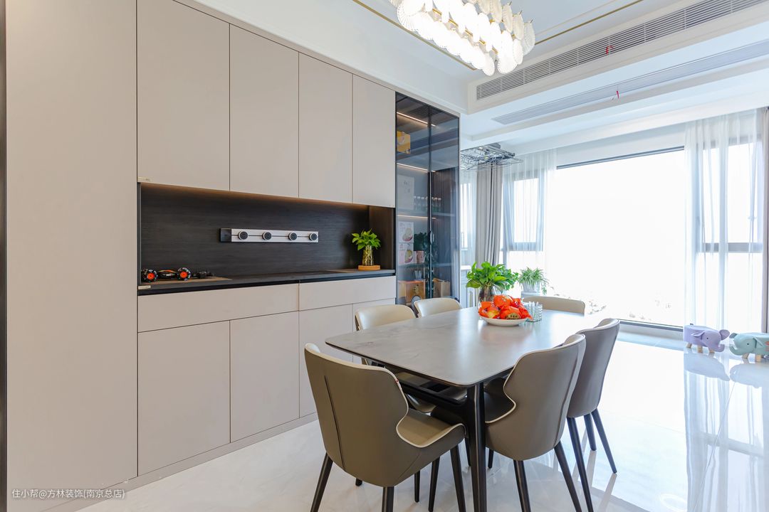 一体式的客餐厅结构,可以让光线和空气相互流通,设计风格和色调与客厅形成统一,线条简约的餐桌,皮质餐椅,将时尚与优雅相融合,让每一餐都充满仪式感。客餐厨不设限的设计之下,空间的流通感让家人之间的交流更加亲密,期间绿色的延续与点缀,也让生活变得轻松又充满想象与未知。