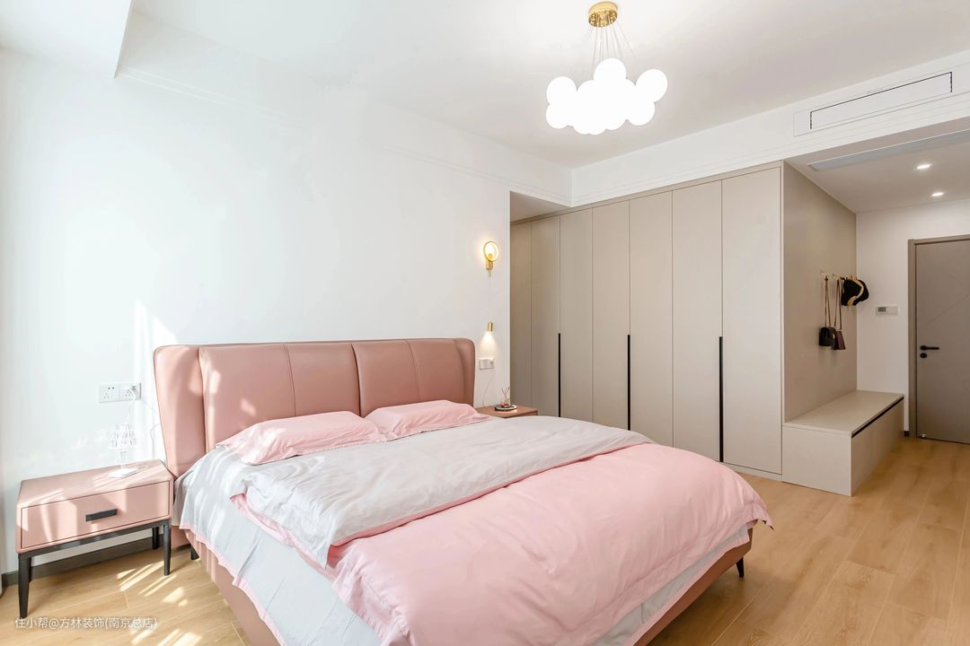 主卧淡雅的色调、极简的线条,营造舒适的视觉效果。带有粉色的软包面料与中性色木质的碰撞,演绎都市时尚魅力,属于夜晚的美好,在这里开始。