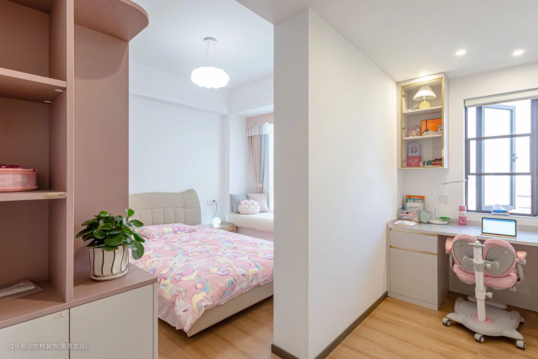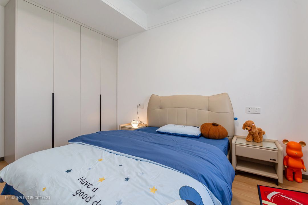 在可爱温柔的女孩房中,采用组合猫猫元素的床头,纯色背景墙玩偶收纳装饰,以及台灯也点缀着的有趣向往,均为空间注入了简约舒适,又充满少女浪漫的情结氛围。男孩房延续了相同的空间布局,窗户在细节的转变中加入书桌的设定,让男孩房也多了一个学习娱乐的场所。浅淡的卧室中加入蓝色的装饰,抱枕、椅子、窗帘与床品,细节的展现也为休息空间营造出清新而惬意的氛围。