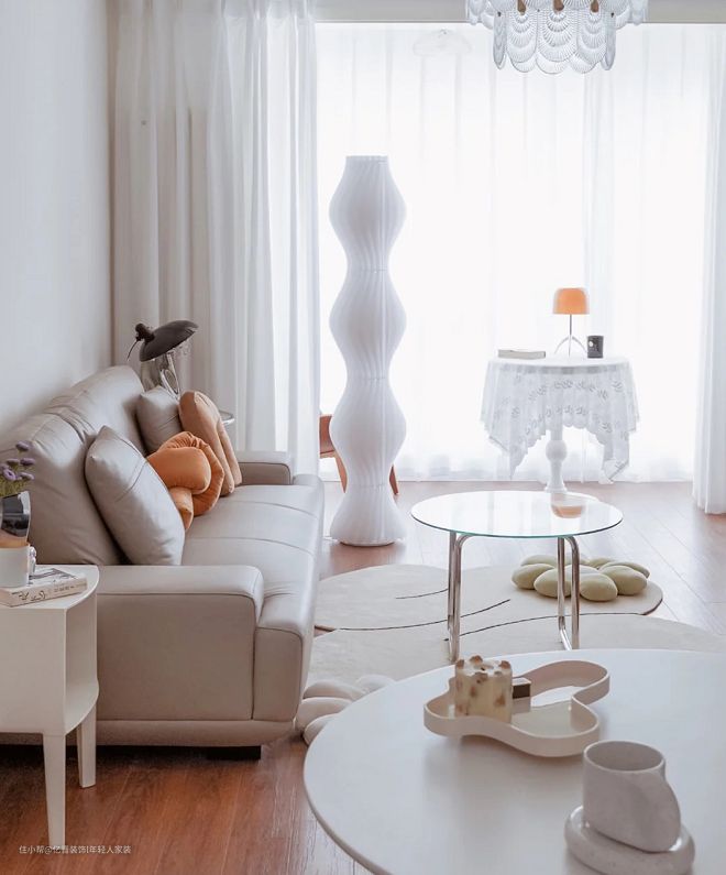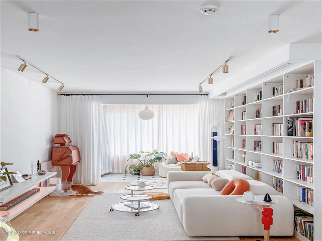 客厅整体采光极佳,以白纱窗帘作为与阳台的软隔断。区域整体色调以白色为主,白色给空间带来一定的提亮。沙发后面设置一整面收纳墙,增添区域的艺术氛围。