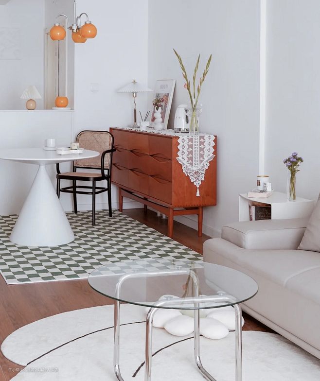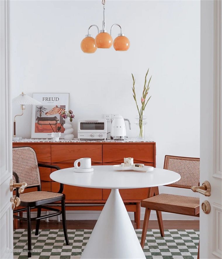 餐厅与公共领域一样保留大白墙,让区域看起来更加干净通透。以樱桃木微笑九斗柜作为餐边柜,给区域带来温馨感。