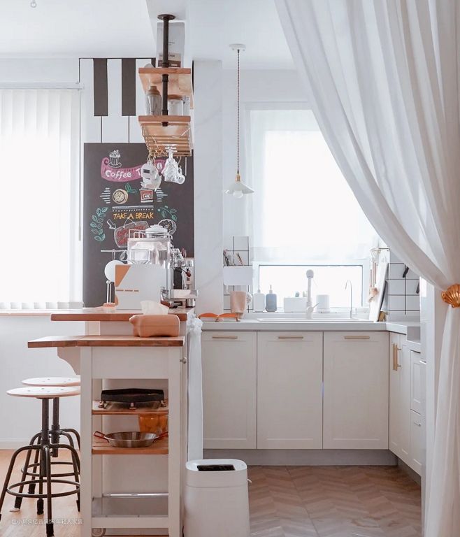 厨房和吧台相衔接。吧台下方是镂空设计,用白色帘子作为遮挡,让区域之间过渡自然。