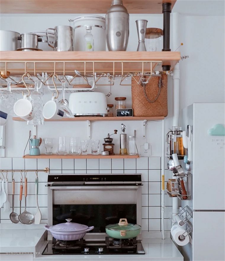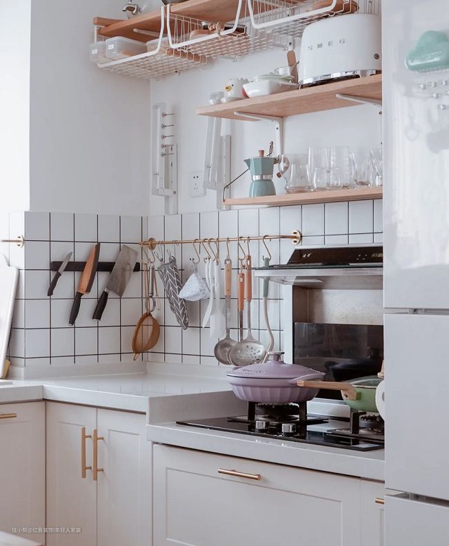厨房整体布局是U型格局的开放式设计,整体延续公共领域风格,以奶白色为主,衔接木色吧台。