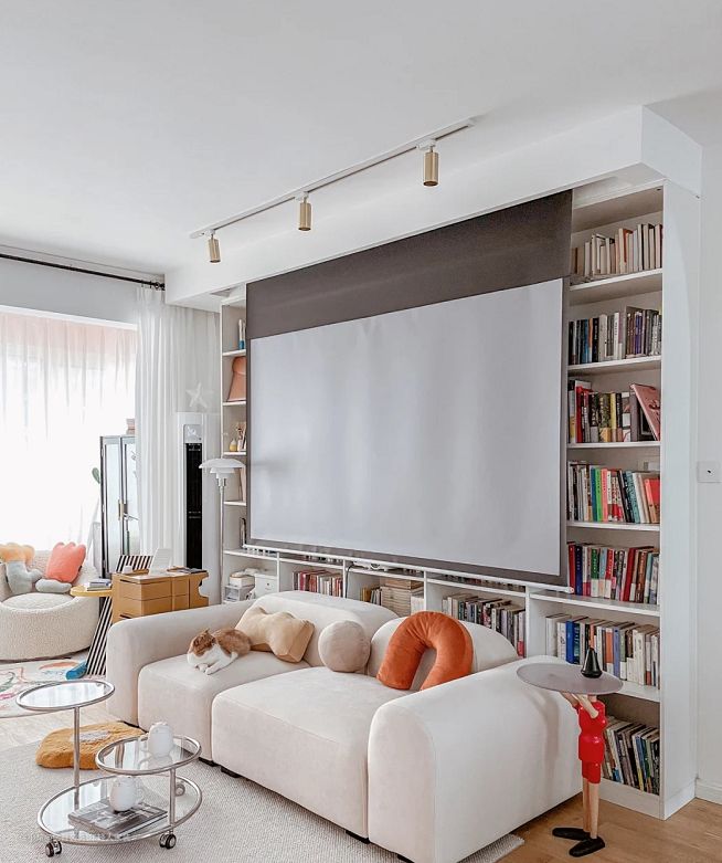 书架里面藏有幕布,以投影的方式代替电视观影,提升观影质量。