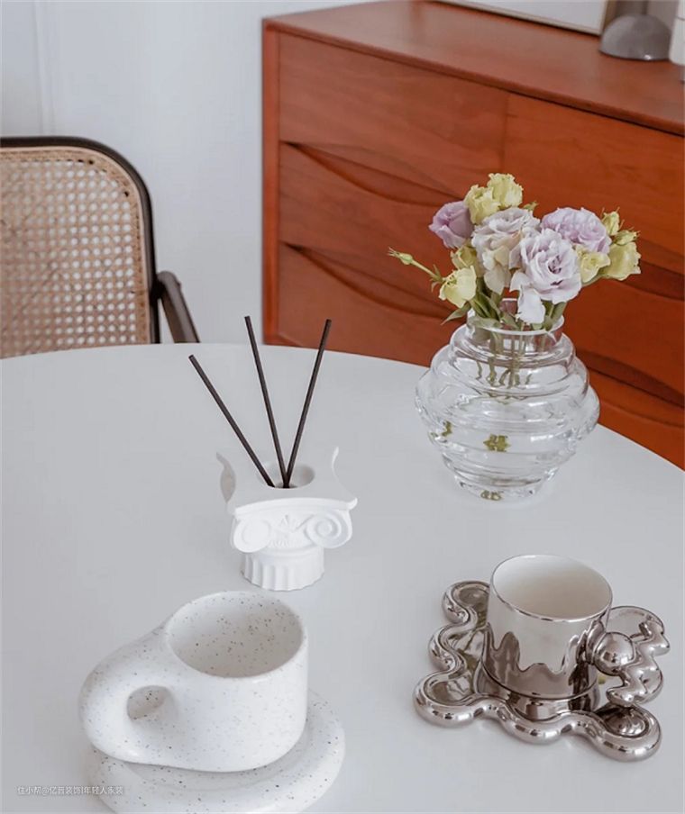 餐桌选用圆型餐桌,比起方型更有聚拢的效果。同时,也为旁边过道留有一定的位置。桌面放置鲜花,让餐桌不孤单。