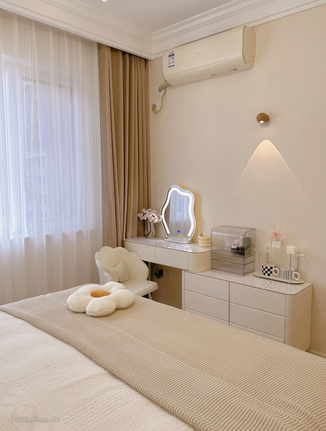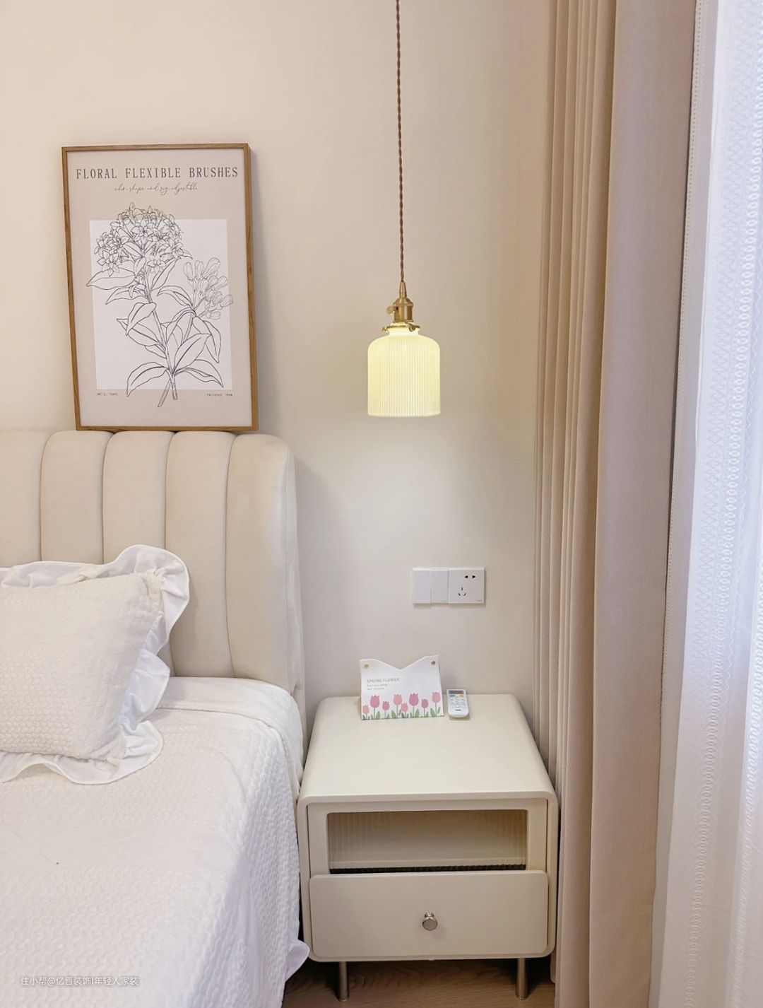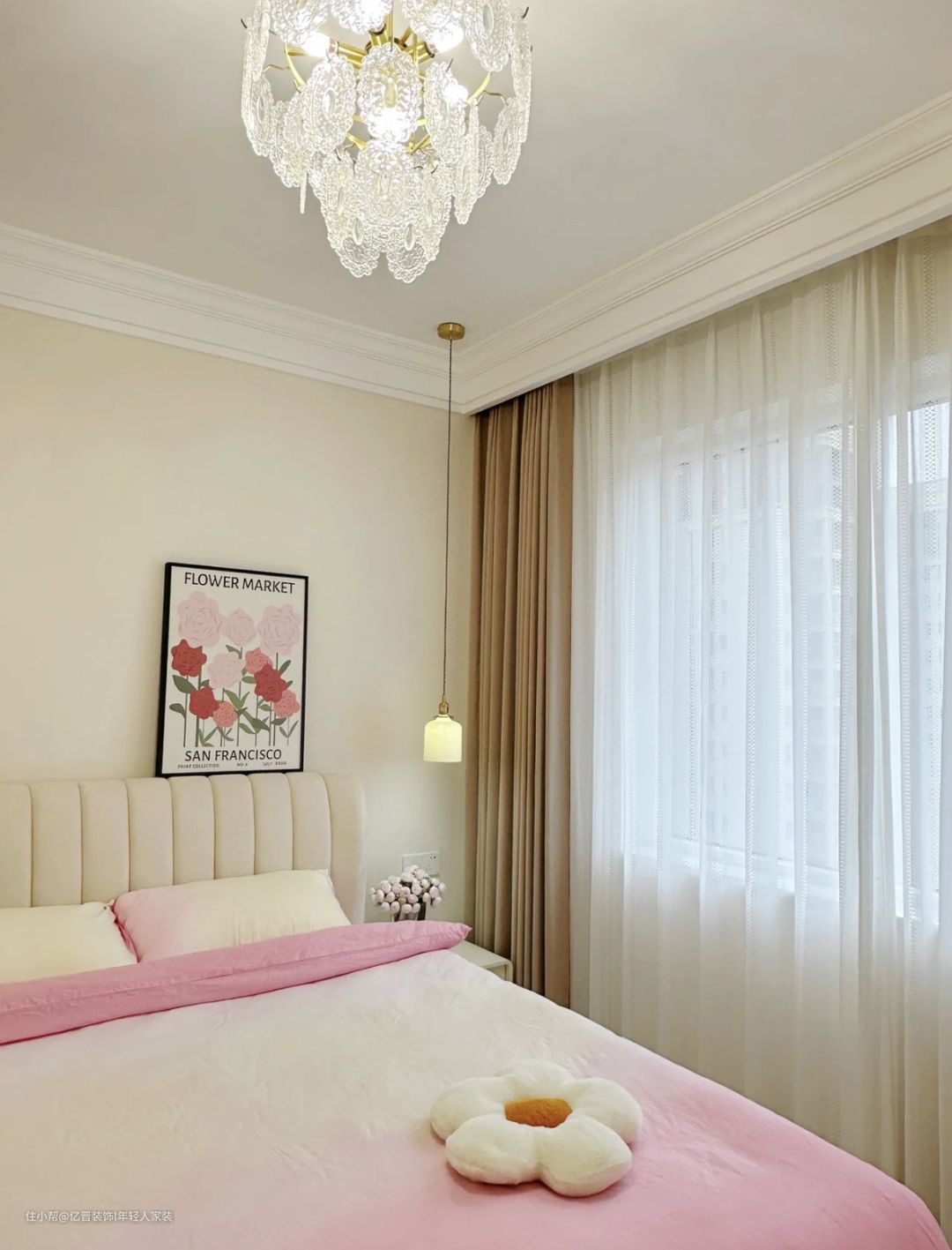 卧室以超治愈奶油色为主色调,淡淡的色调让人感到放松沉静,再搭配粉嫩嫩的床品,让每天入睡和醒来都是惬意美好。