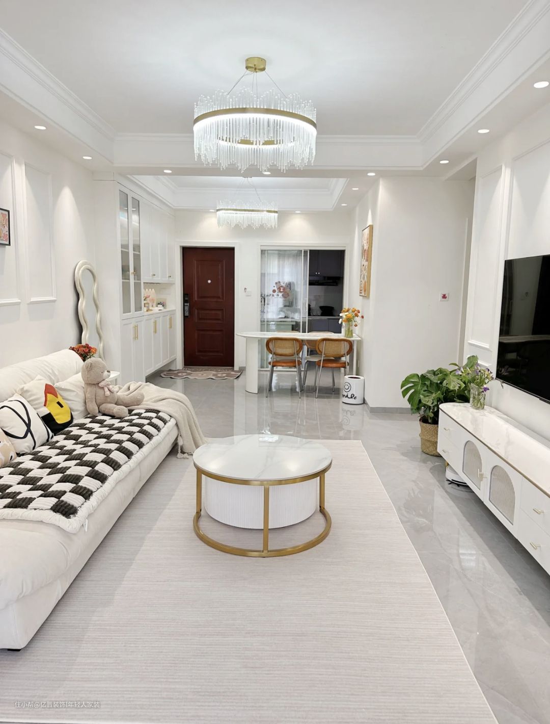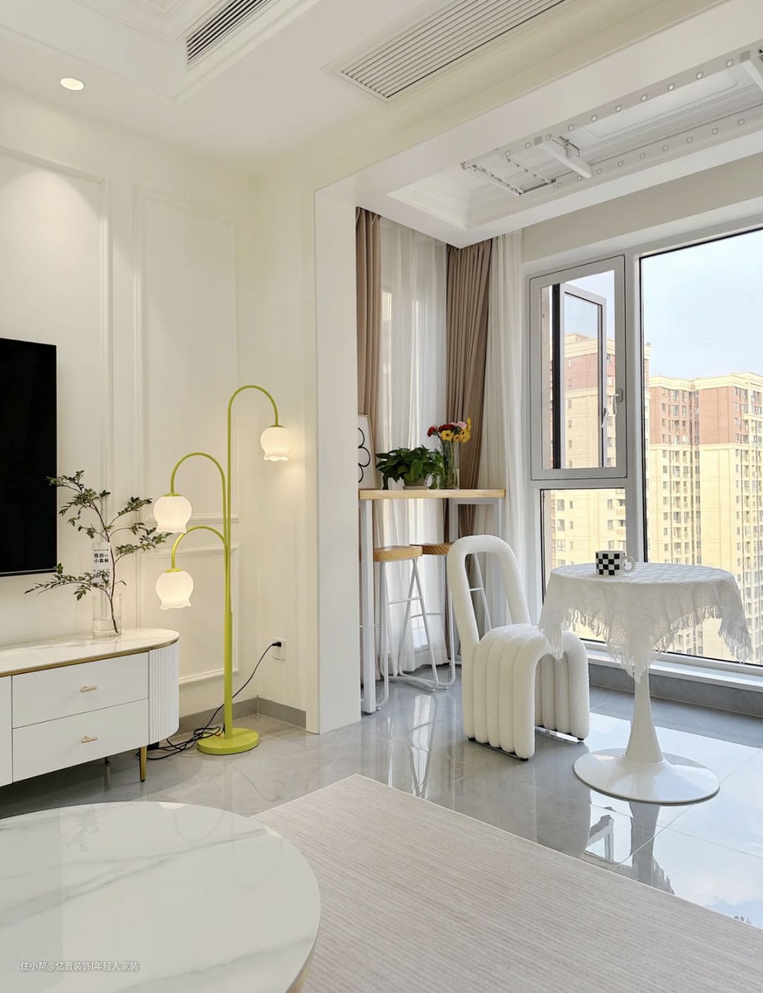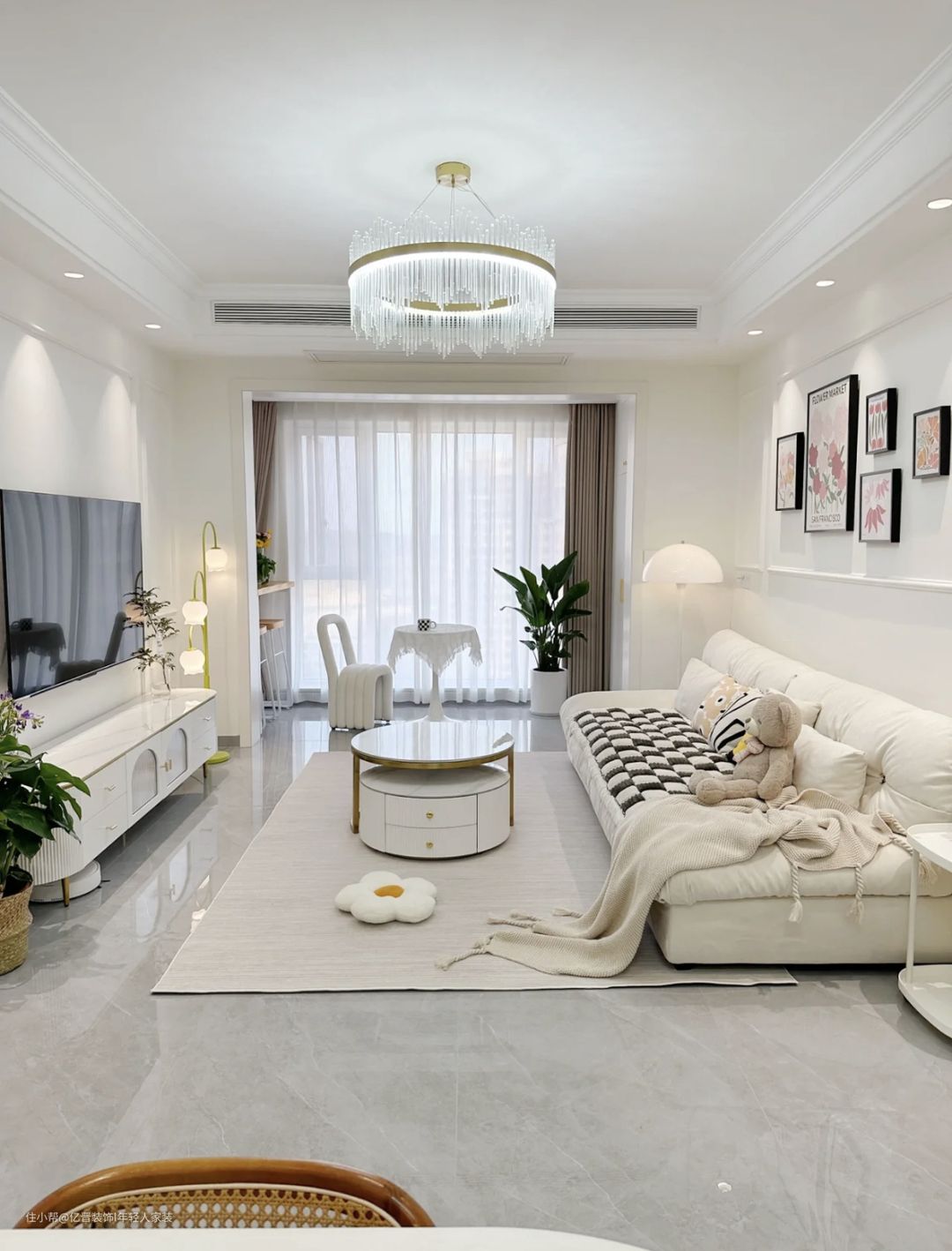 客厅打通阳台,地砖通铺,让客厅与阳台连接,整个通透感更显大又整洁。全屋白色系乳胶漆,不同光线呈现不同柔和的美。