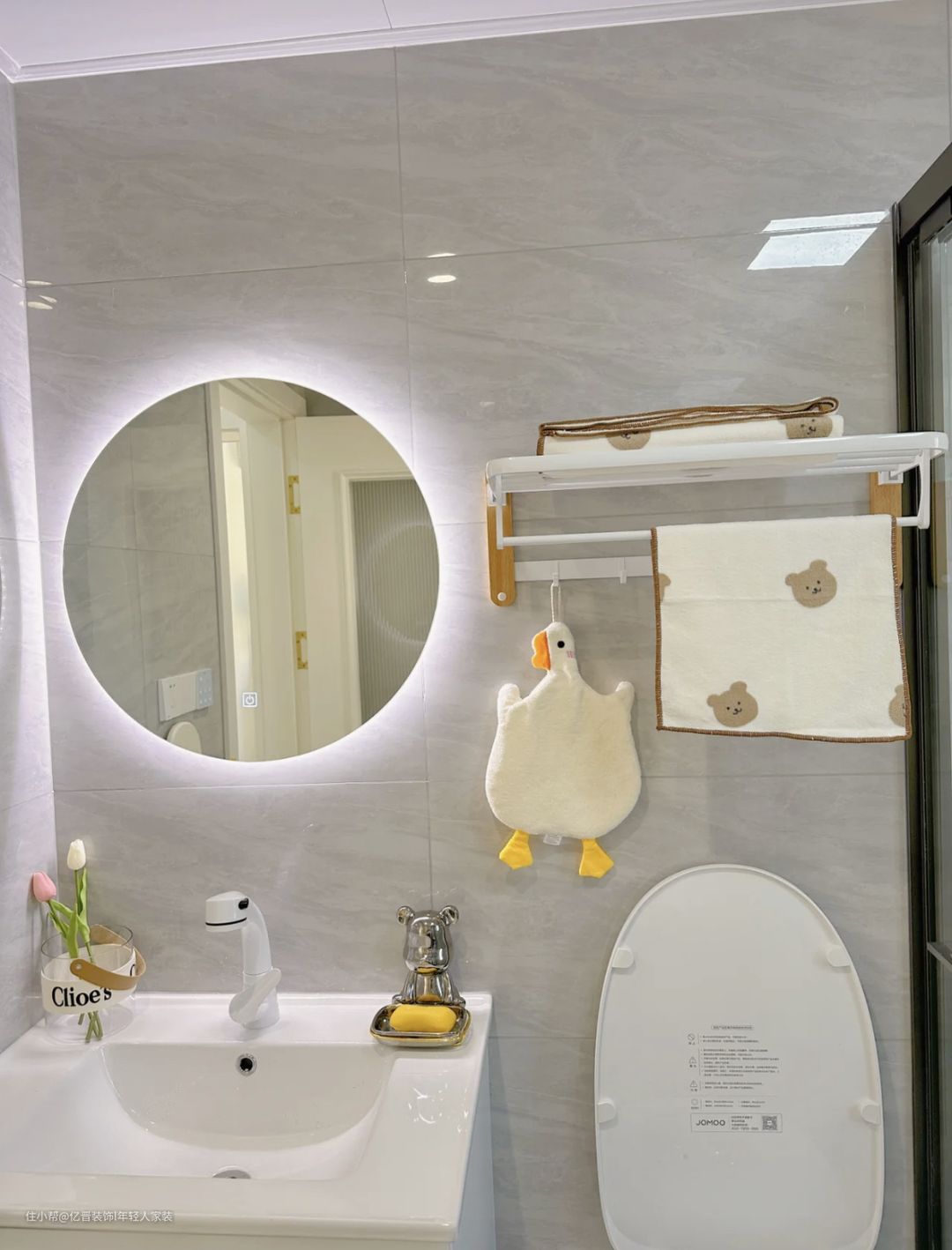 卫生间以简约浅灰为主,高低的洗手盆设计,让日常清理更方便。镜子采用智能发光镜子,可以很好的对于日常需求的光源进行调节。
