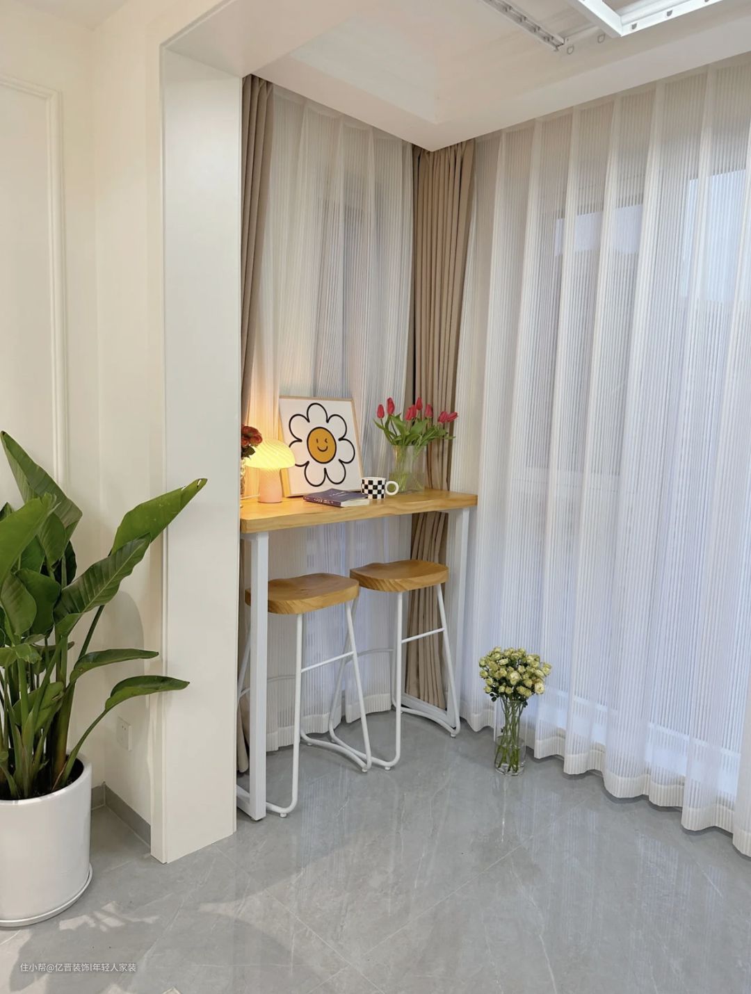 阳台一角做原木吧台,一个属于自己的空间,摆上喜欢的花,夜晚时分,点上一盏小灯,成为休憩一角