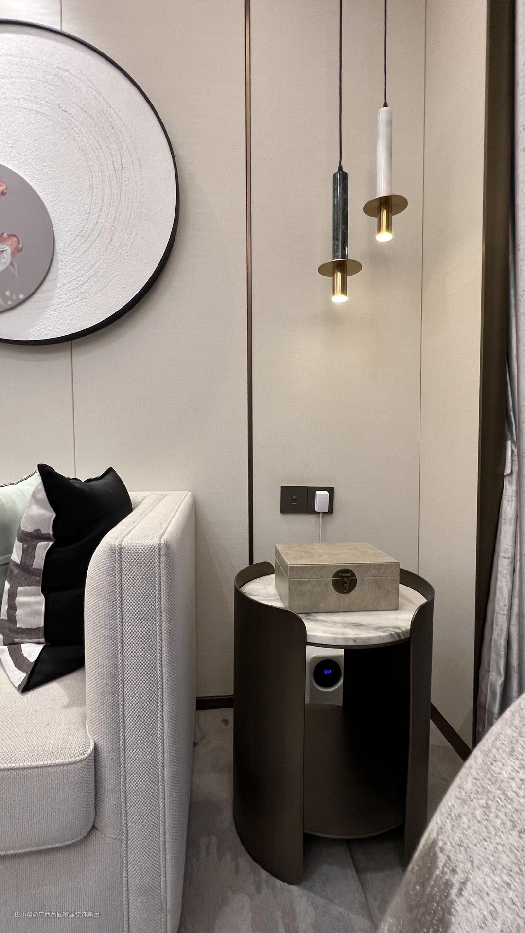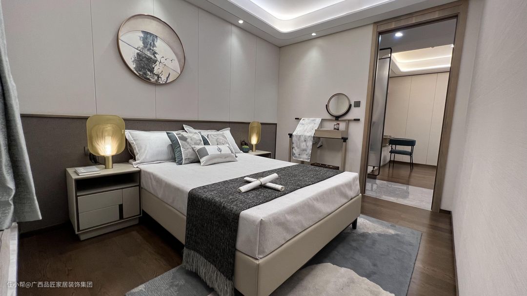 主卧是私人空间,所以更注重舒适性和个性化的设计。简约的现代化风格与中式元素相结合,给人一种既舒适又有气息的感觉。床头的壁灯充分考虑了光线的温暖感,让整个房间的氛围更加温馨。在床头的墙面上加入了书法作品的装饰,给整个房间增添了文化的气息。
