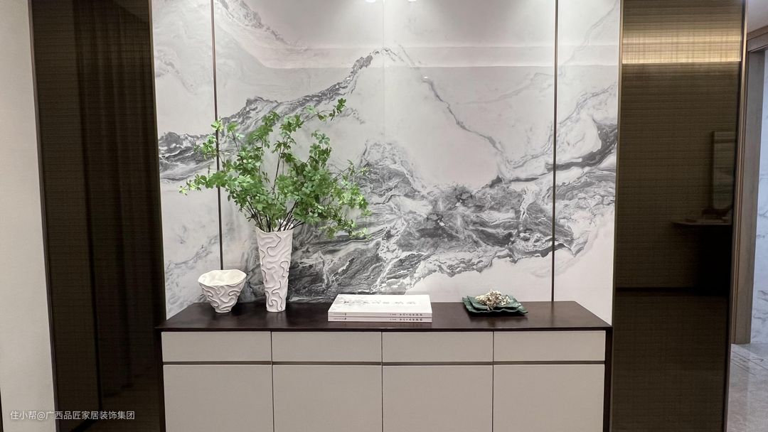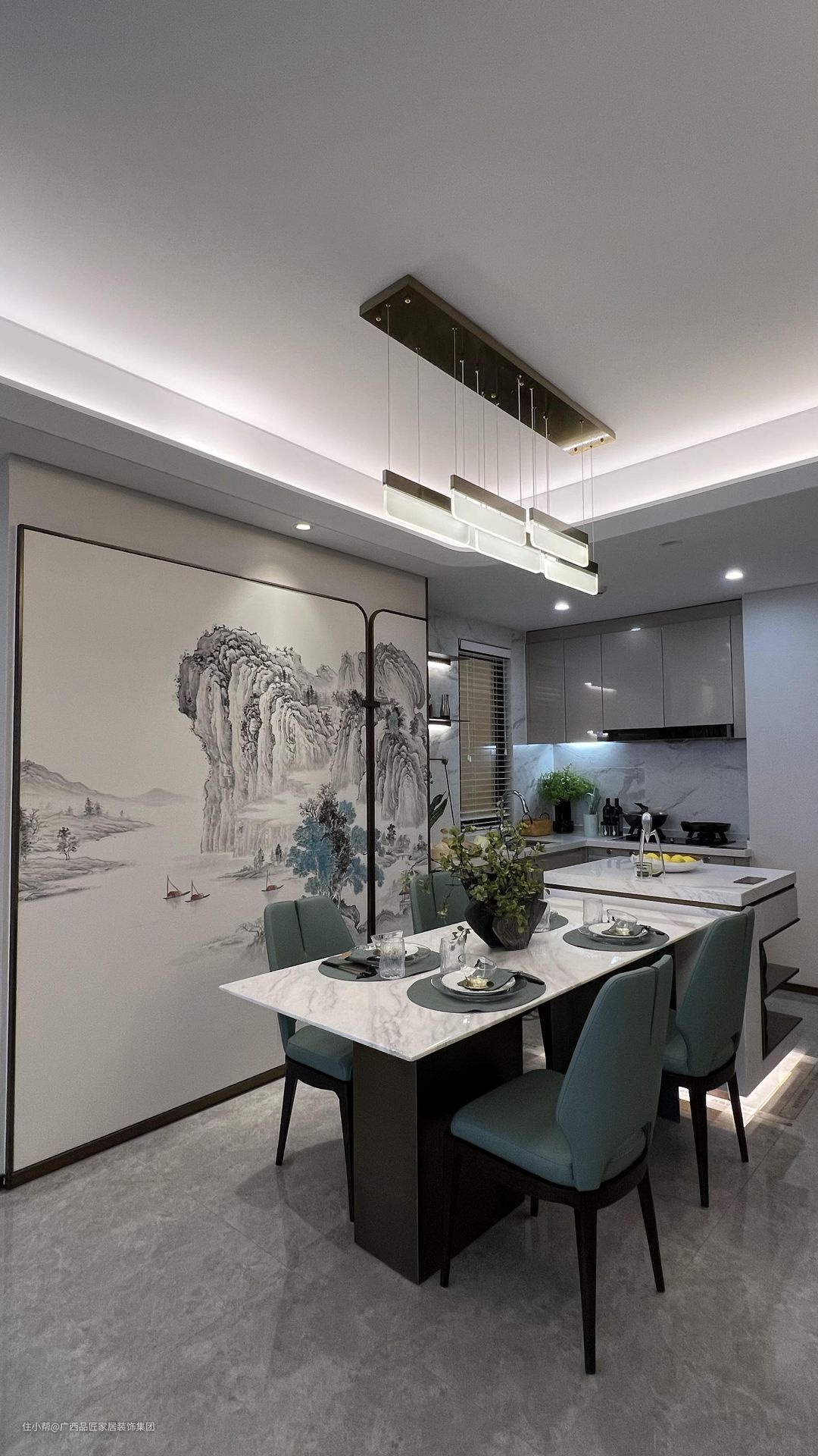 餐厅与客厅共用一处空间,但是在装饰上并没有被忽视。简洁的餐桌与椅子搭配,让整个餐厅更加精致而优雅。在餐厅墙面上放置了一些巨型绿植,不仅能够起到装饰作用,同时也起到空气净化的作用。墙面的护墙板采用米色麻纹设计,与客厅的装饰风格相呼应,整个空间协调统一。