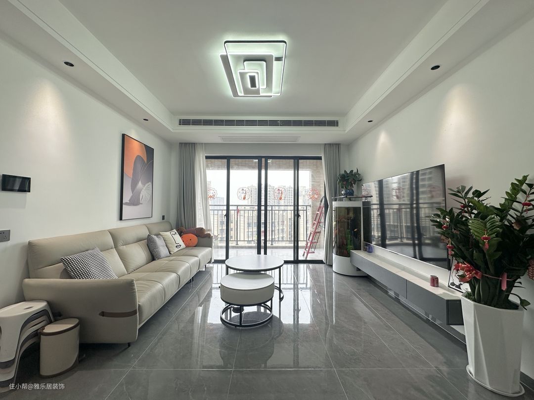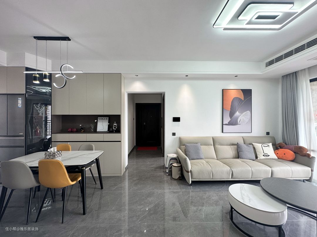 黑白灰奠定空间的基调,整体设计都围绕着“简单有温度的风格”来打造,灰色地砖通铺,简约色彩形成松弛自然的居住环境。主灯+走边筒灯照明、氛围都能满足,这种灯光搭配也更适合家里有长辈和儿童的家庭。