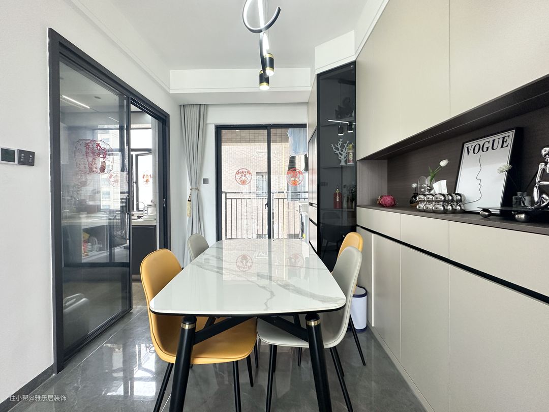 过道起到分割延伸的作用,视觉效果自动划分两大功能区,白色岩板餐桌搭配撞色餐椅,简约不显沉闷。