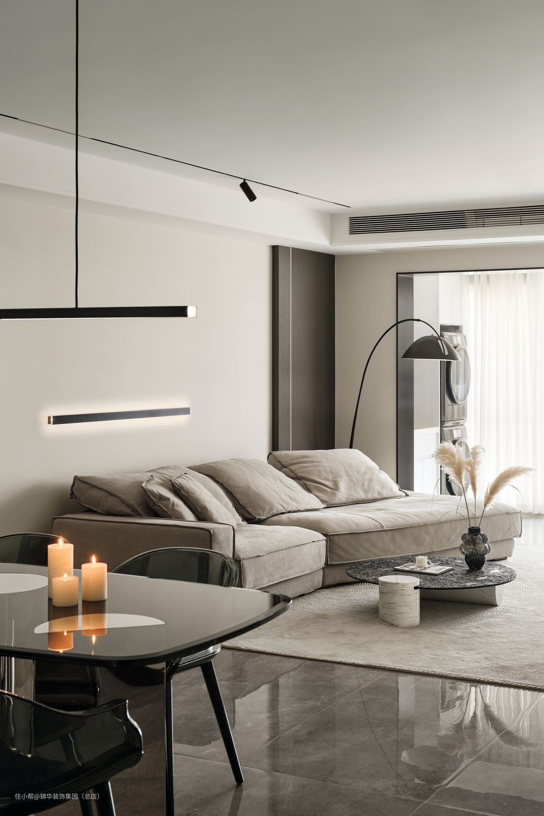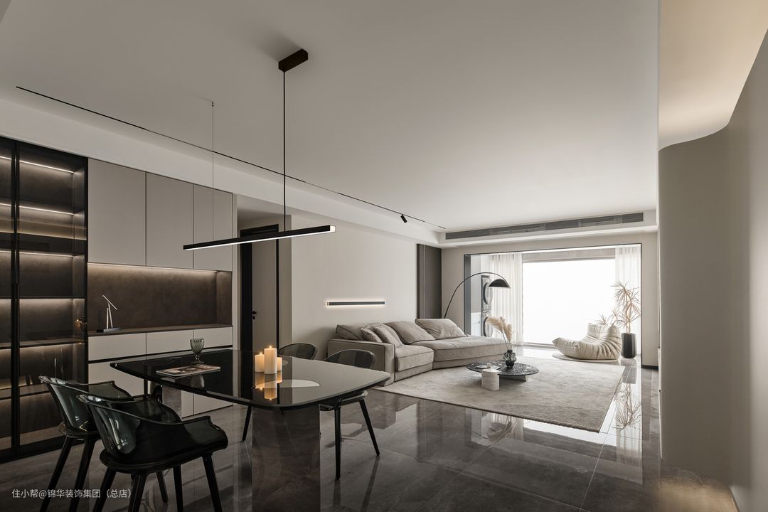 入户玄关,正前方视线顺延,墙面弧面造型,无形之中打破了穿堂的风水之说,无意间增加了玄关的空间感,又丰富了餐厅区域的立体感。没有过多的装饰,点线面的构架,一箭三雕。 家里主要的色调以“黑白灰”为主,客厅无主灯设计,墙面浅色为基础,加入一些隐藏灯带,部分驼色点缀。整个空间,钓鱼灯的弧形立杆、加上黑色透明餐桌椅的弧形边角,又与墙面造型呼应,打破了“黑白灰”极简的单一性。