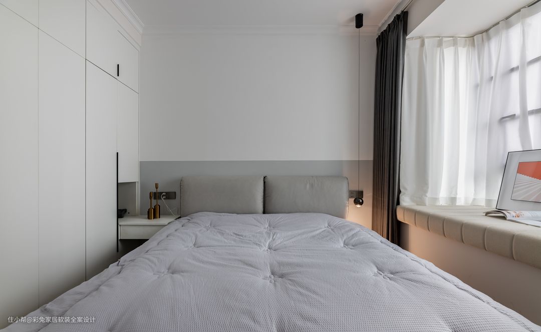 主卧建转角的衣橱,增大了收纳空间,同时避免主卫生间对床开门的尴尬。衣橱到顶设计,米白柜体和墙面颜色一致,隐形拉手大气简洁。 主卧选择浅灰色软床,与地面瓷砖颜色相协调。营造清爽优雅的休息空间氛围。床头柜和衣柜一体打造,节省了空间,也增添了不少方便。