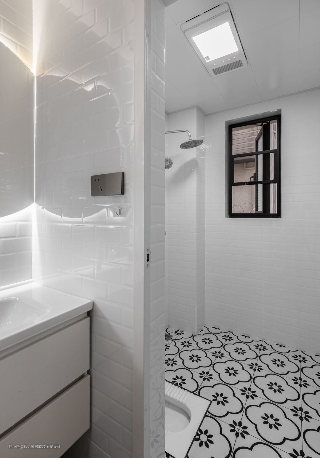 从客厅就能看到客卫,所以洗手台位置的装饰性也很重要,用拱形门来呼应客厅的整体柔和风格。 墙面铺白色瓷砖,地面铺黑白花纹小砖,营造活泼趣味的空间氛围,让家更加温馨。 墙面安装流线造型的智能镜,带有防雾、照明等多种功能,让护理时光充满乐趣。定制白色一体陶瓷台盆,表面光洁无缝更方便打理卫生。吊柜抽屉方便收纳护理用品。