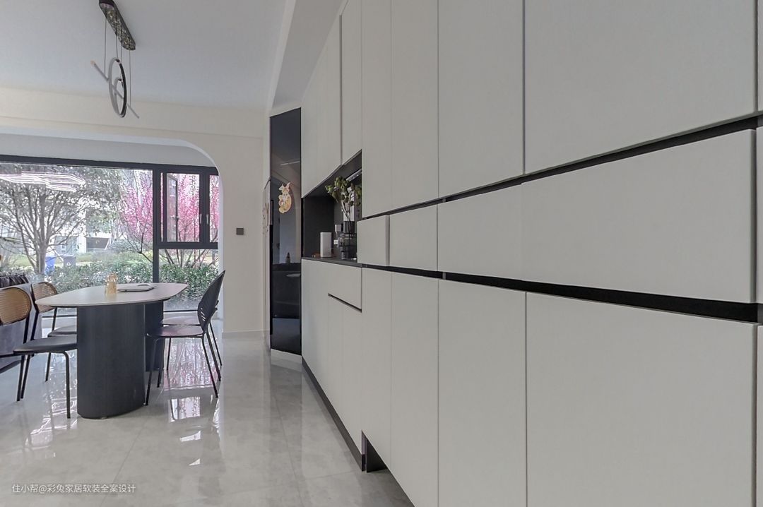 餐厅和客厅一体打造,空间更加通透明亮。顶面做部分吊顶,隐藏空调设备,同时为走道与客餐厅做出空间划分,给人更和谐的空间秩序美感。 客餐厅地面通铺800*800mm浅灰色亮面地砖,让空间更加明亮。浅灰地面与家具的黑色线条建立了清晰的对话,对比中,呈现出一个明朗清爽的空间观感。 餐桌选择白色岩板桌面,弧线造型的长桌1600*800mm大小,搭配曲线造型的餐厅吊灯,让餐厅空间变得更柔和。 餐边柜中段做成开放式壁橱,接入水管,壁挂直饮水机,方便取热水泡茶;餐边柜黑色面板和黑色的餐桌框架相对应,让餐厅空间更显简约精致。