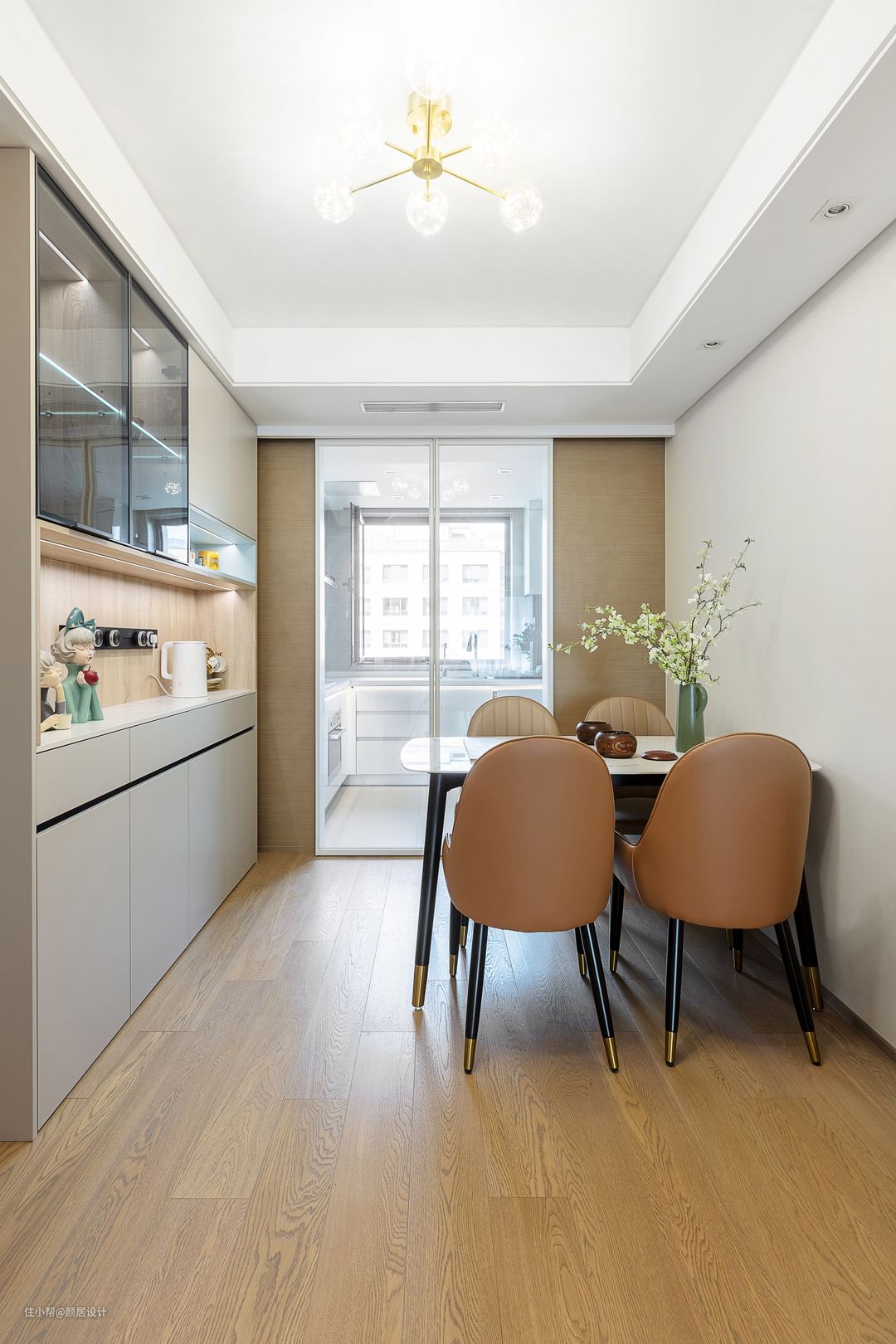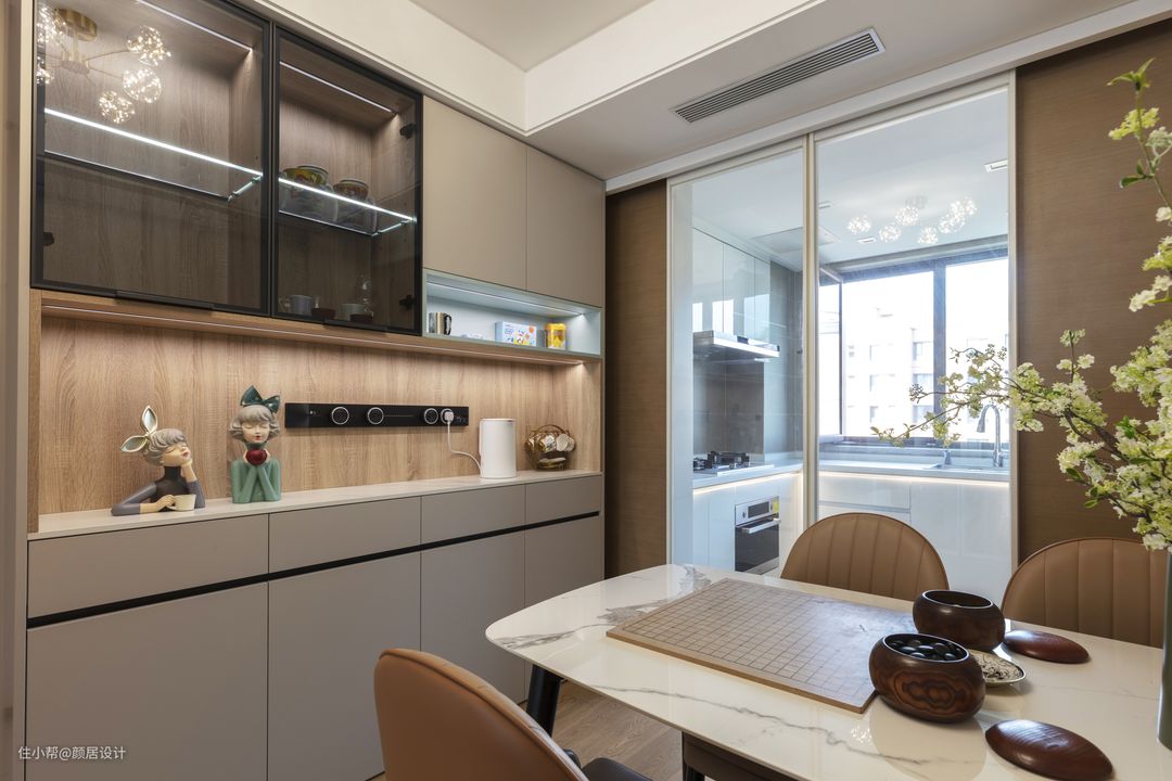 餐厅空间简简单单,一张四人岩板餐桌和四把简洁的餐椅,满足一家人的一日三餐。 餐桌对面定制满墙的餐边柜,满足餐厅的收纳需求。底部封闭式柜门,收纳不常用的物品,中部镂空50公分,安装轨道插,方便放置餐厅常用小电器。上部一半玻璃柜门,一半封闭柜门和开放格的组合,打破单调感。