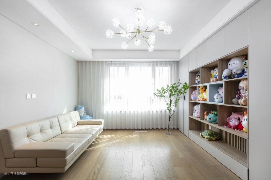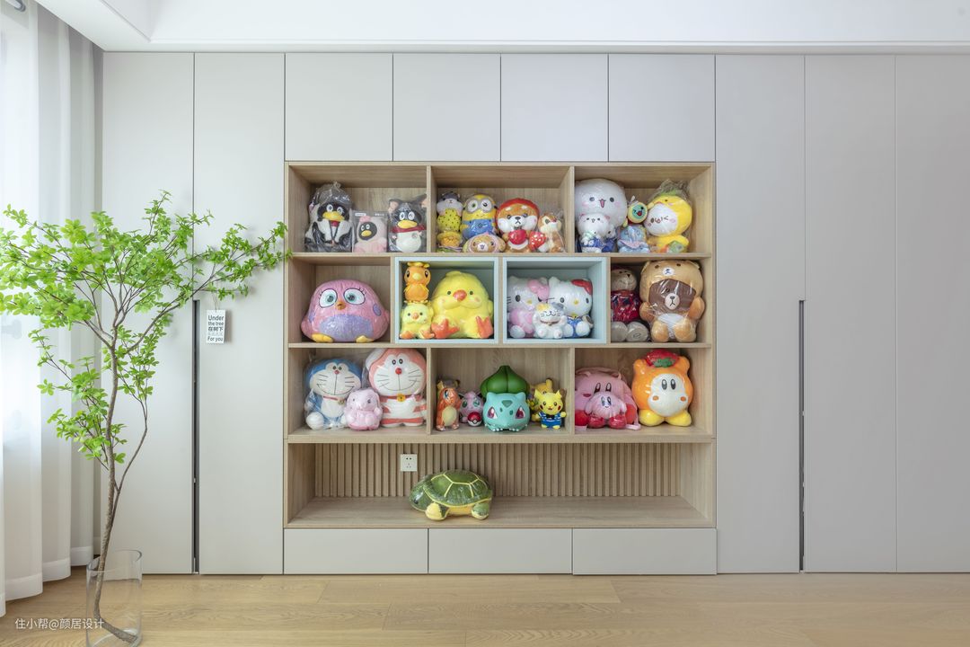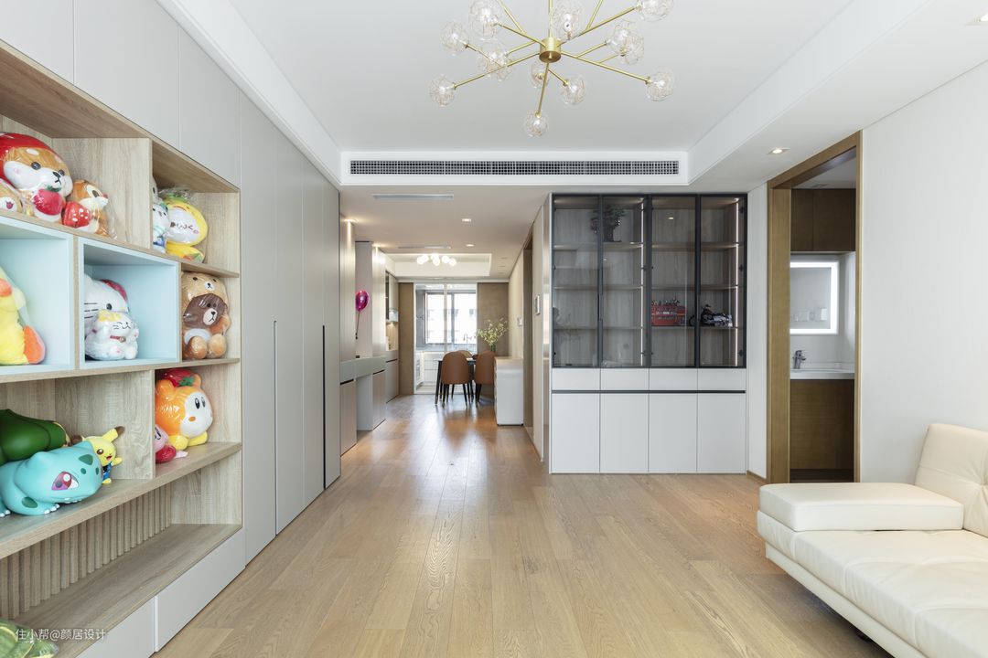 客厅保留了原来的木色地板,选择米灰色的简洁沙发,摒弃传统的茶几布置,留出更多的活动空间。不要电视,将电视收纳柜的核心位置设计为开放格,用于收纳展示抓回来的娃娃们,每一只娃娃都会让他想起抓到时的开心与幸福。 电视收纳柜一门到顶,隐藏式拉手设计,简洁美观。中间的开放格选择与地板近似的实木色,底部做格栅设计,更显温润。中间特意内嵌了两个浅蓝色的格子,与玄关的景观台相呼应。 客厅的另一侧增加了一组展示柜,用于收纳男主的硬核收藏品,黑色的玻璃门,嵌入灯带,满满的科技范儿。
