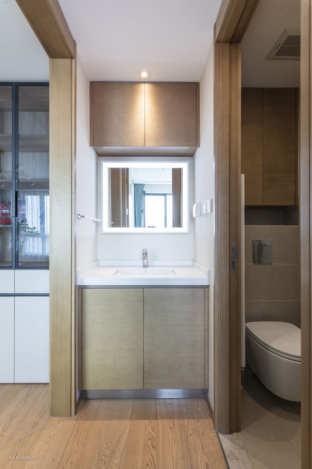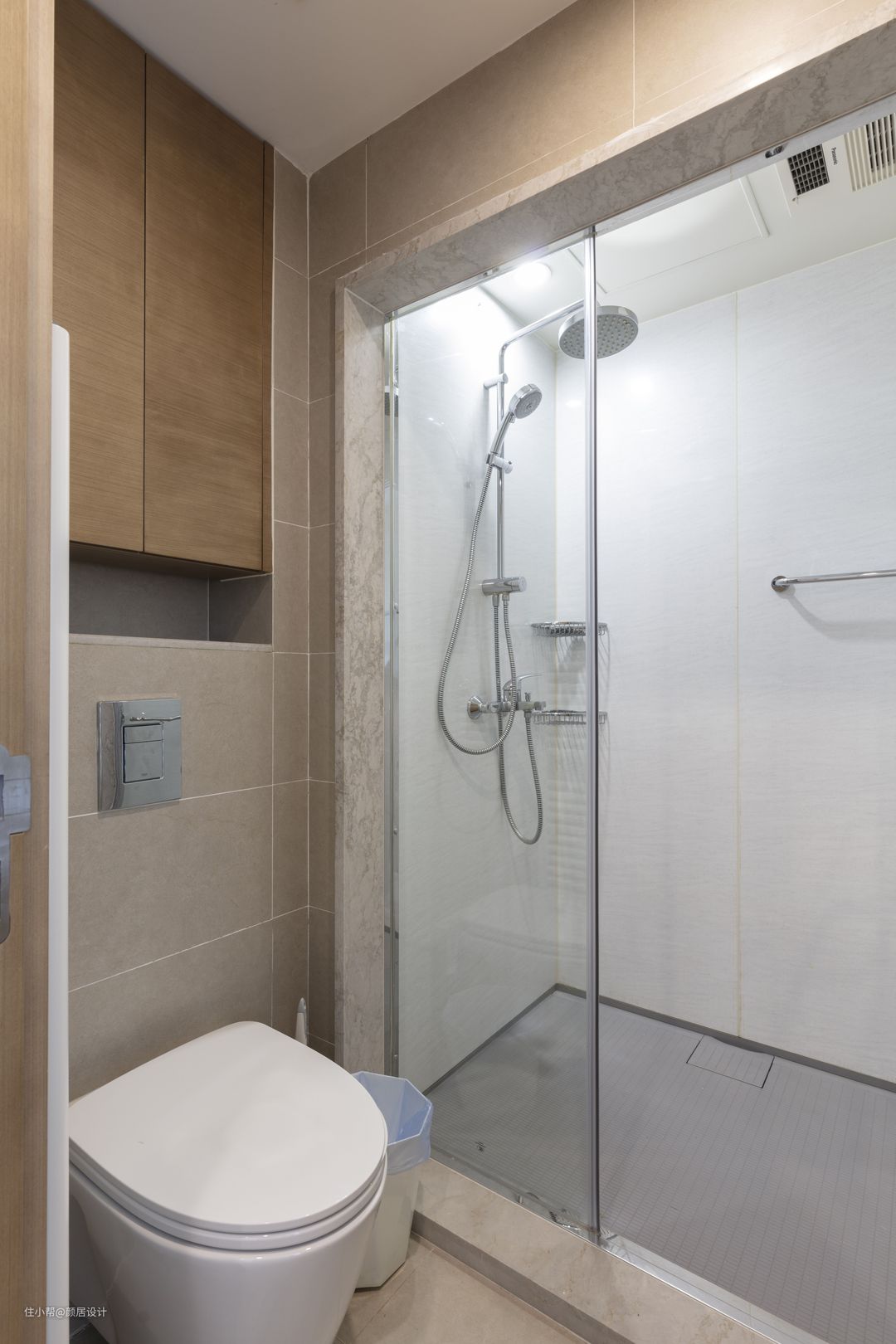 卫生间保留原有精装,干湿分离设计,满足功能需求。一字型独立淋浴房,防止淋浴时,水溅到马桶区域,地面也做了防滑处理,大理石拉槽,避免老人滑倒。