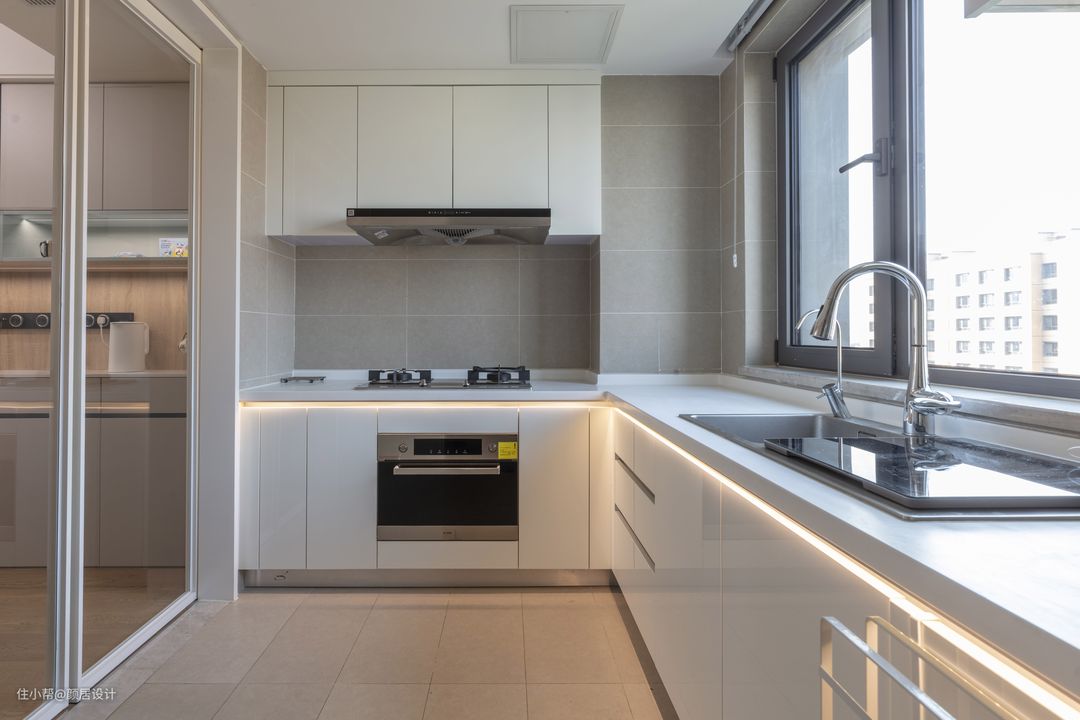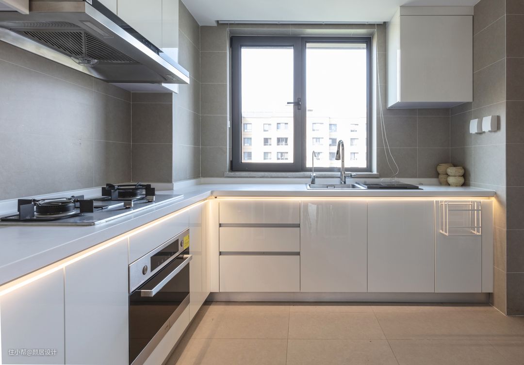 厨房是一个宽敞明亮的大厨房,橱柜做L型橱柜,按洗→切→炒的动线合理布局,冰箱放置在了通往生活阳台的方向。 厨房门保持了原有的玻璃推拉门,让更多的自然光能够穿过厨房照进餐厅。地柜嵌入暖色光源的灯带,降低墙地面瓷砖的冰冷感。