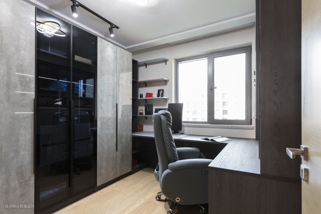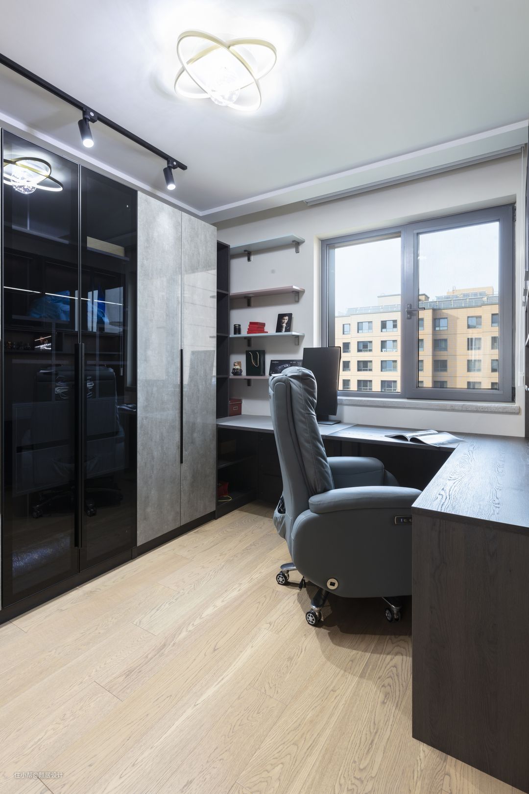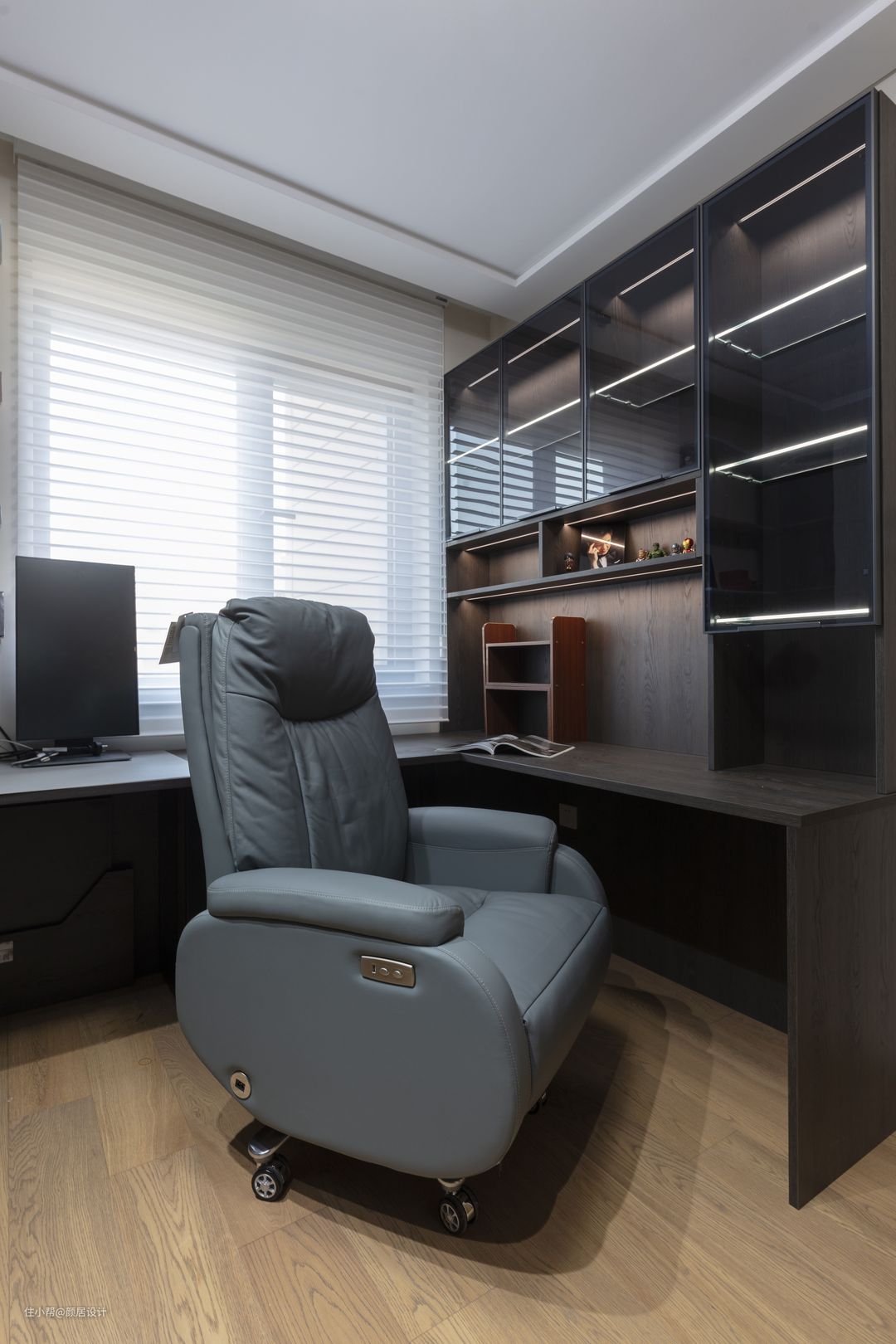 书房主要男主使用,男主比较喜欢深色系,虽然保留了原木色的地板,通过深色的柜体和书桌的搭配,整个空间的色调一样沉着稳重。 背后的柜体,一半深色的玻璃柜门,用作展示柜,放置男主的收藏品,一半封闭柜门,放置男主的衣物,弥补主卧空间衣物收纳的不足。在衣柜与书桌连接处,还设计了一组开放格,便于使用,墙上的搁板也十分实用。 书桌是定制的L型书桌,靠墙一侧的书柜与书桌一体,书柜的玻璃柜门与开放格错落有致,内嵌的灯带营造一种高级感。窗帘用香格里拉帘代替繁琐的传统窗帘,干净、利落,而且还可以调节不同的光影效果。