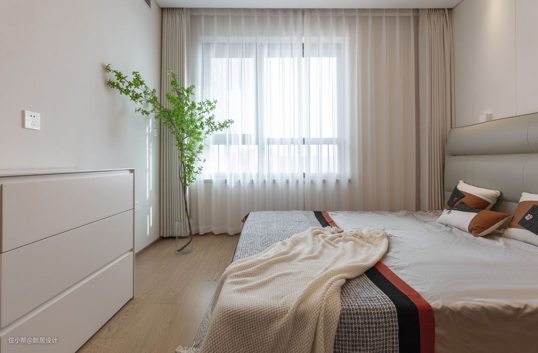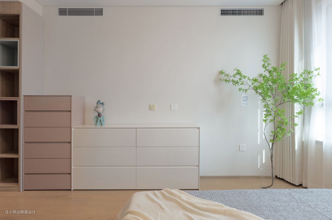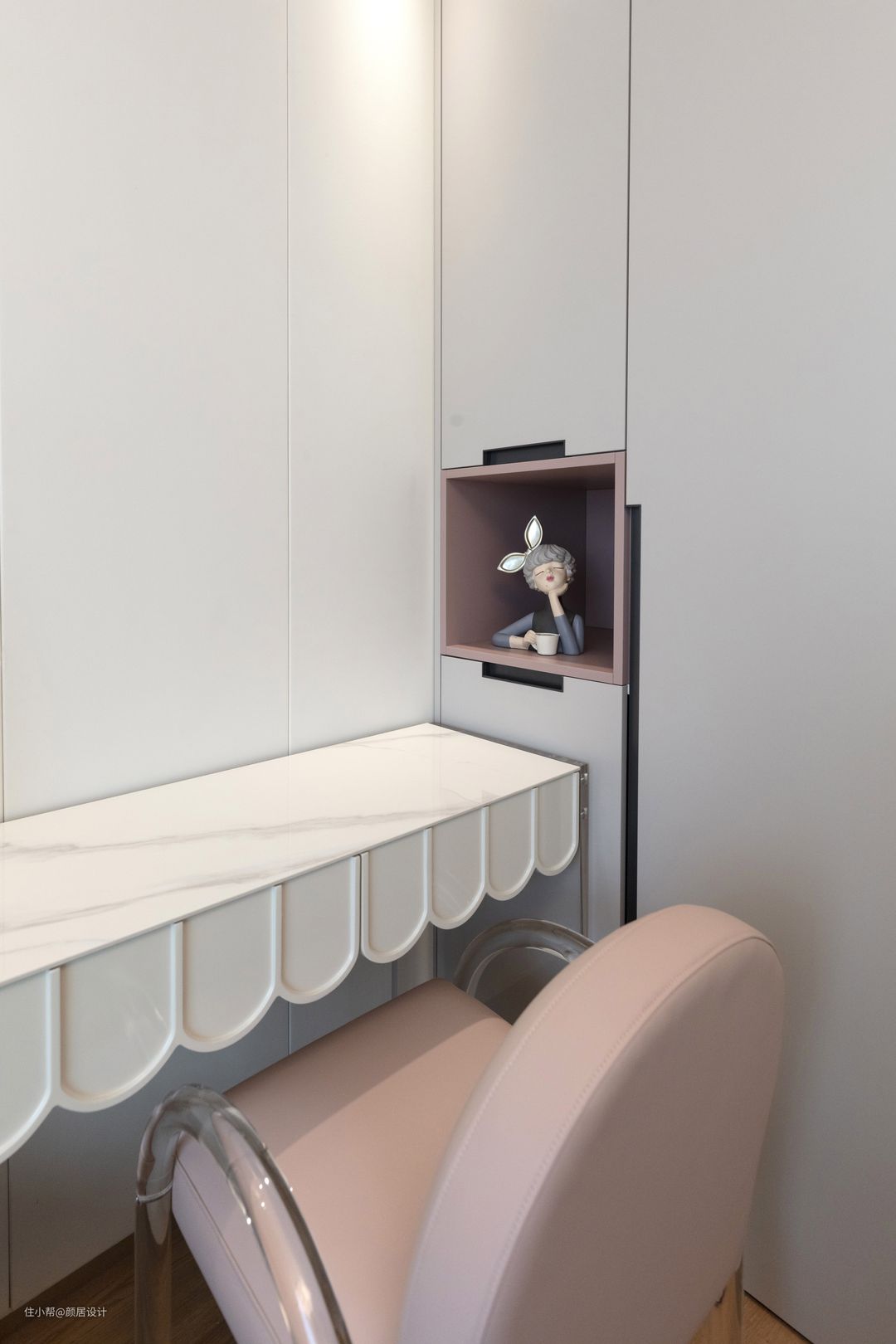 卧室空间比较紧凑,舍弃了一边的床头柜,为女主安置了梳妆台,搭配粉色的公主水晶椅。选择女主喜欢的软包双人床,看上去就充满软软的舒适感。 利用卧室门后墙体定制收纳柜,到床尾区域用两个错落有致的成品斗柜接应,降低通高收纳柜带来的压抑感。主卧窗帘选择与墙面颜色相同的米白色,搭配透光不透人的幻影纱,效果不是一般的惊艳。衣柜与梳妆台衔接处留了一个粉色的开放格,方便女主收纳常用的物品,同时让空间充满趣味性。